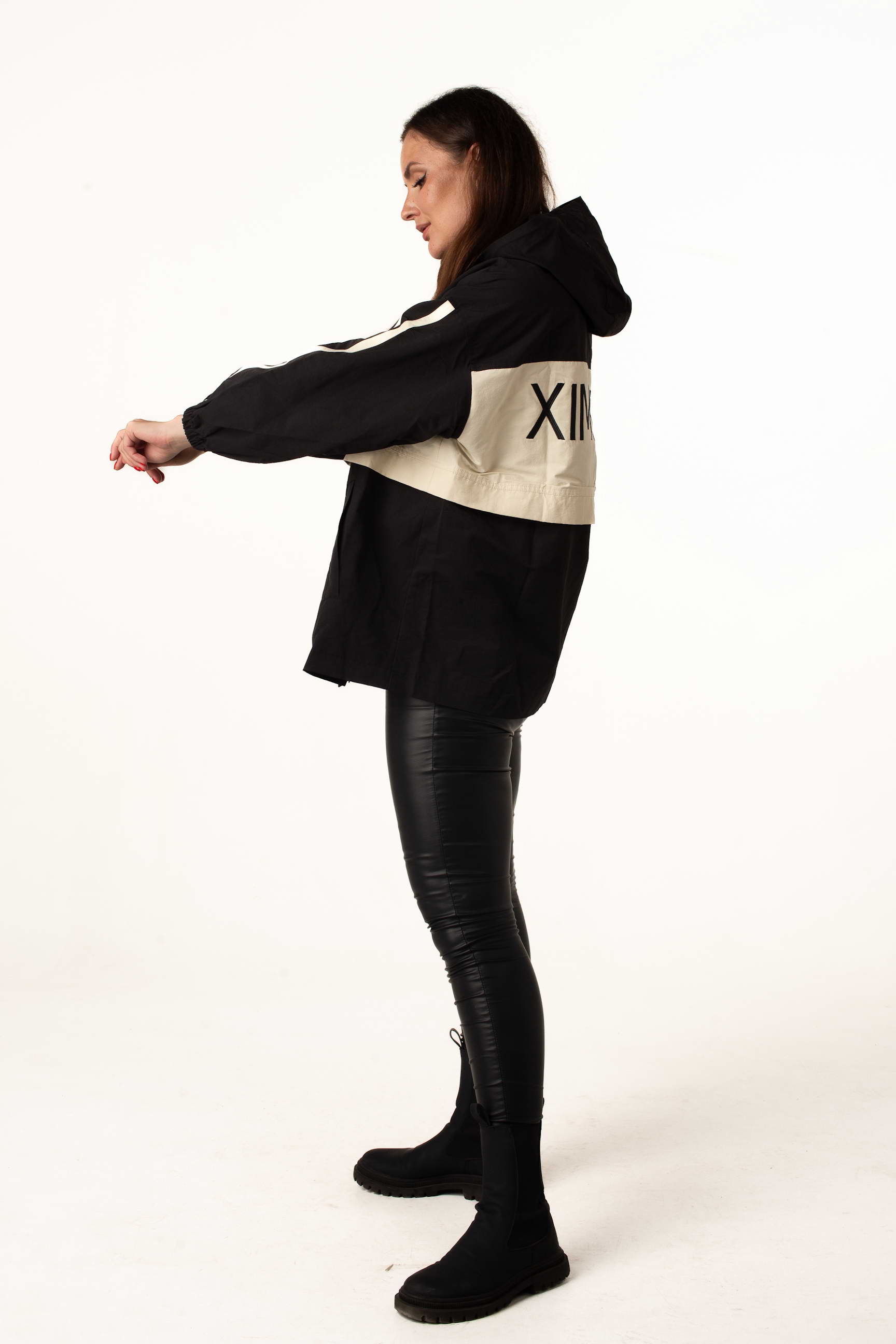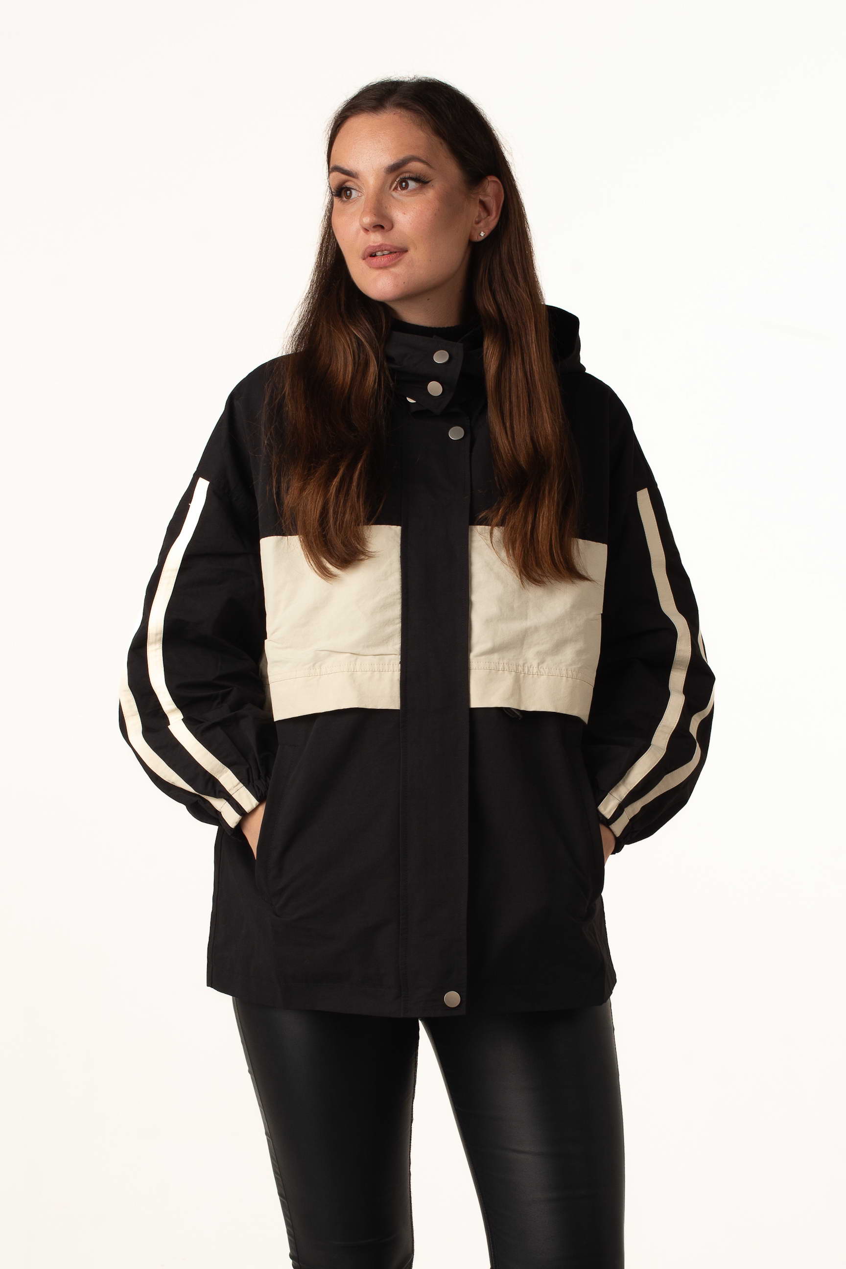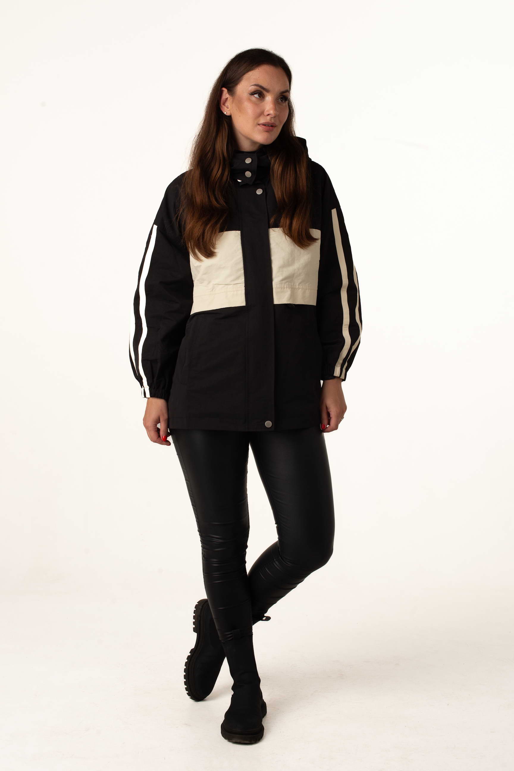 Жіноча вітровка для теплої весни та осені у трендовому чорно-білому кольорі поєднує стильний дизайн із практичністю. Комір-стійка з капюшоном захищає від вітру, а куліска по талії дозволяє регулювати посадку та створювати жіночний силует.
