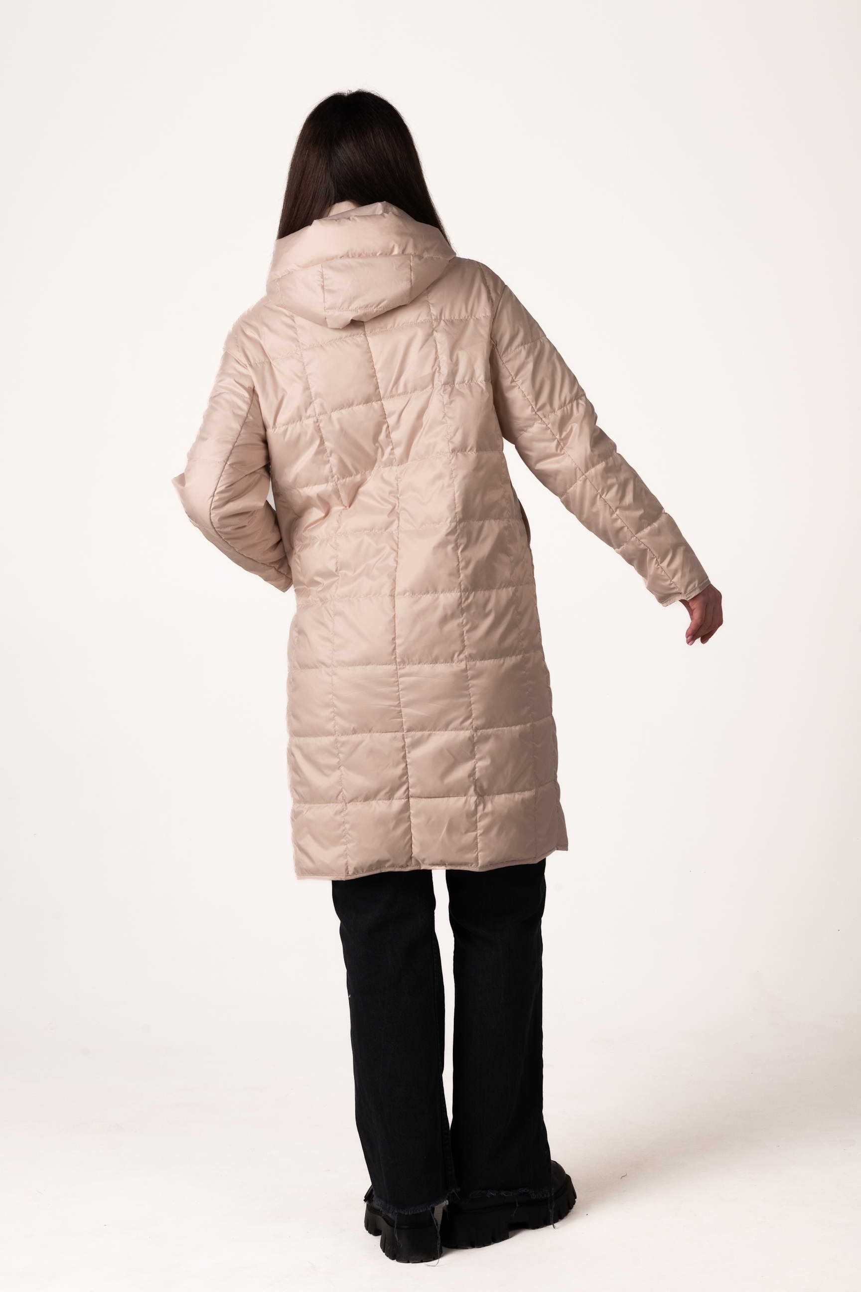 Оригінальна комбінована прострочка — горизонтальна по переду та у вигляді квадратів по спинці — створює стильний візуальний акцент і підкреслює сучасний характер моделі. Довжина 100 см робить куртку максимально комфортною для прохолодної погоди та міських прогулянок.