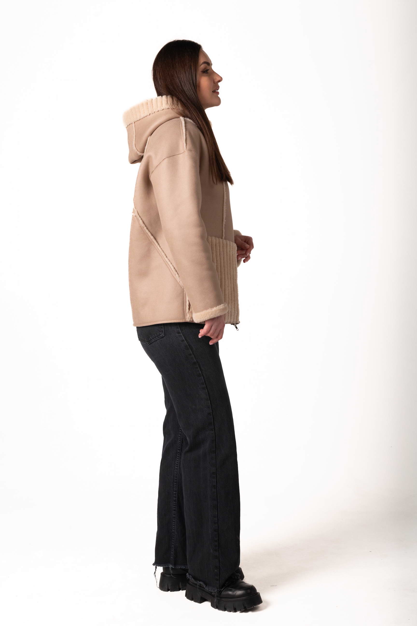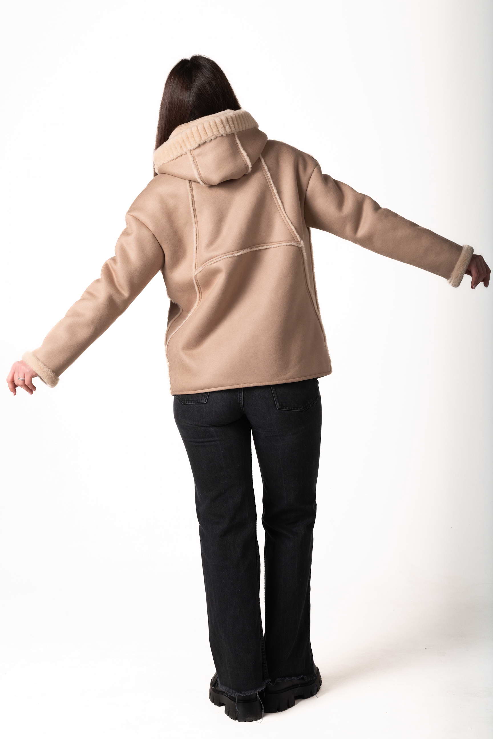 Особливість цієї моделі — двосторонній дизайн: одна сторона виготовлена з екодубляжу, інша — з еко-хутра, що дає змогу змінювати стиль і адаптувати куртку під будь-який образ.