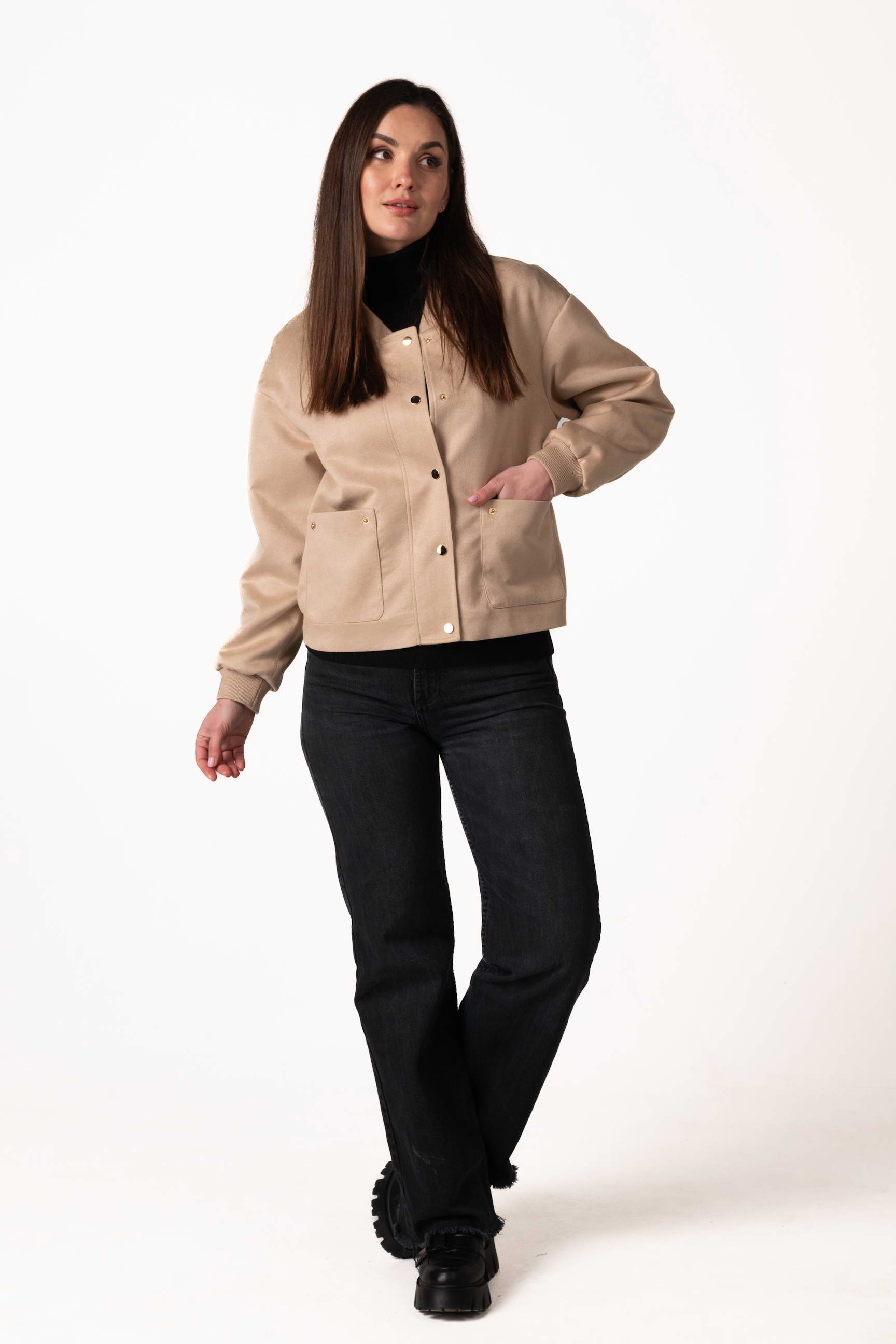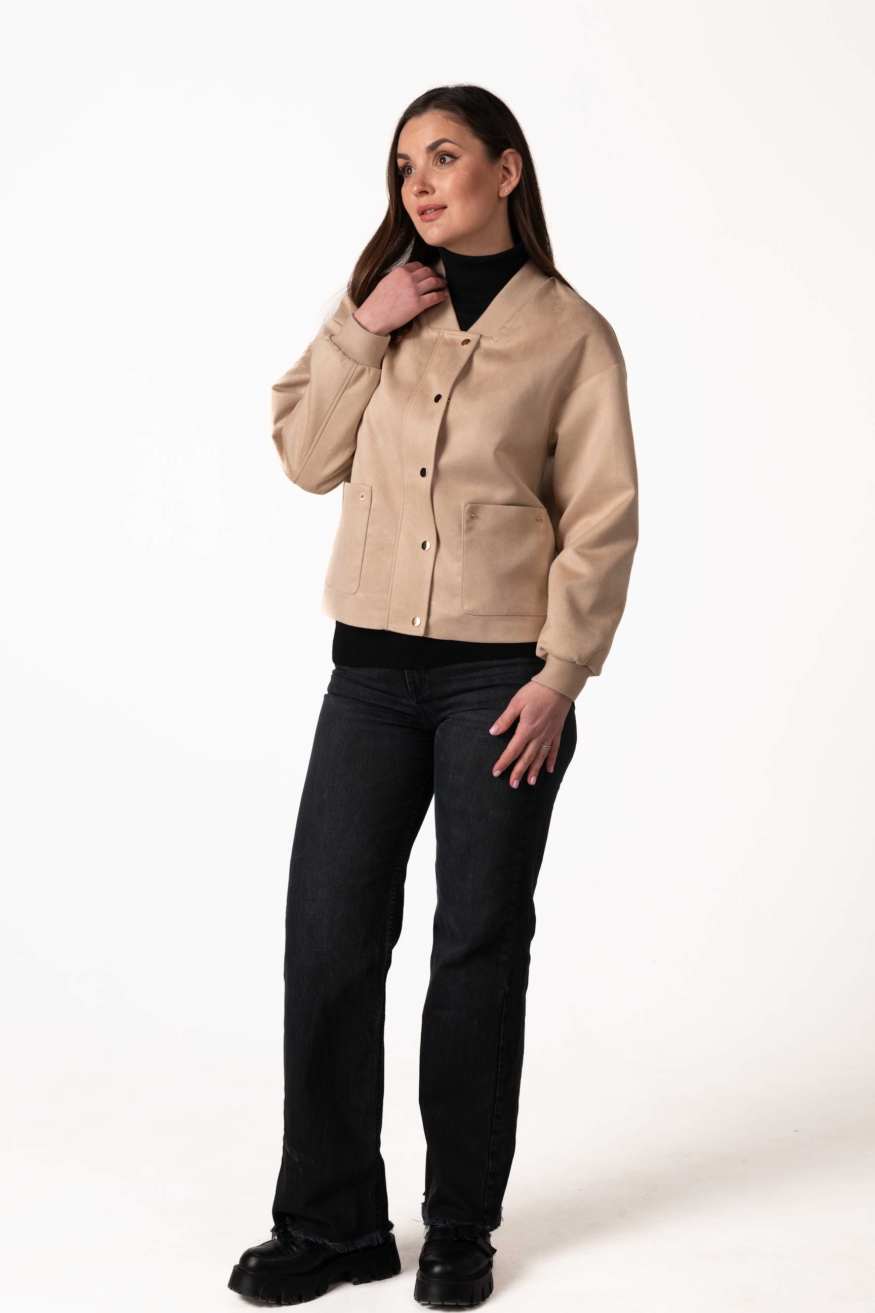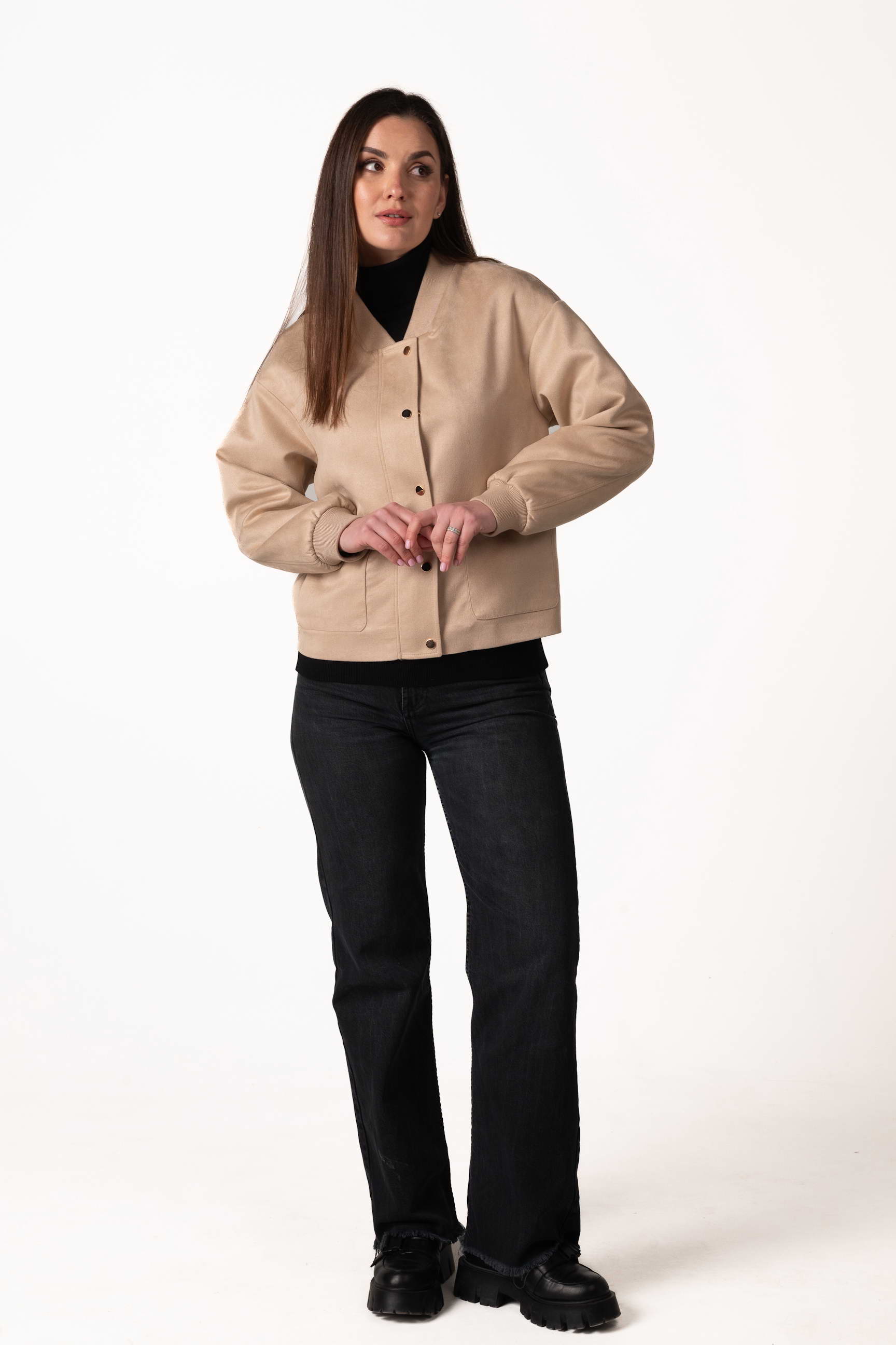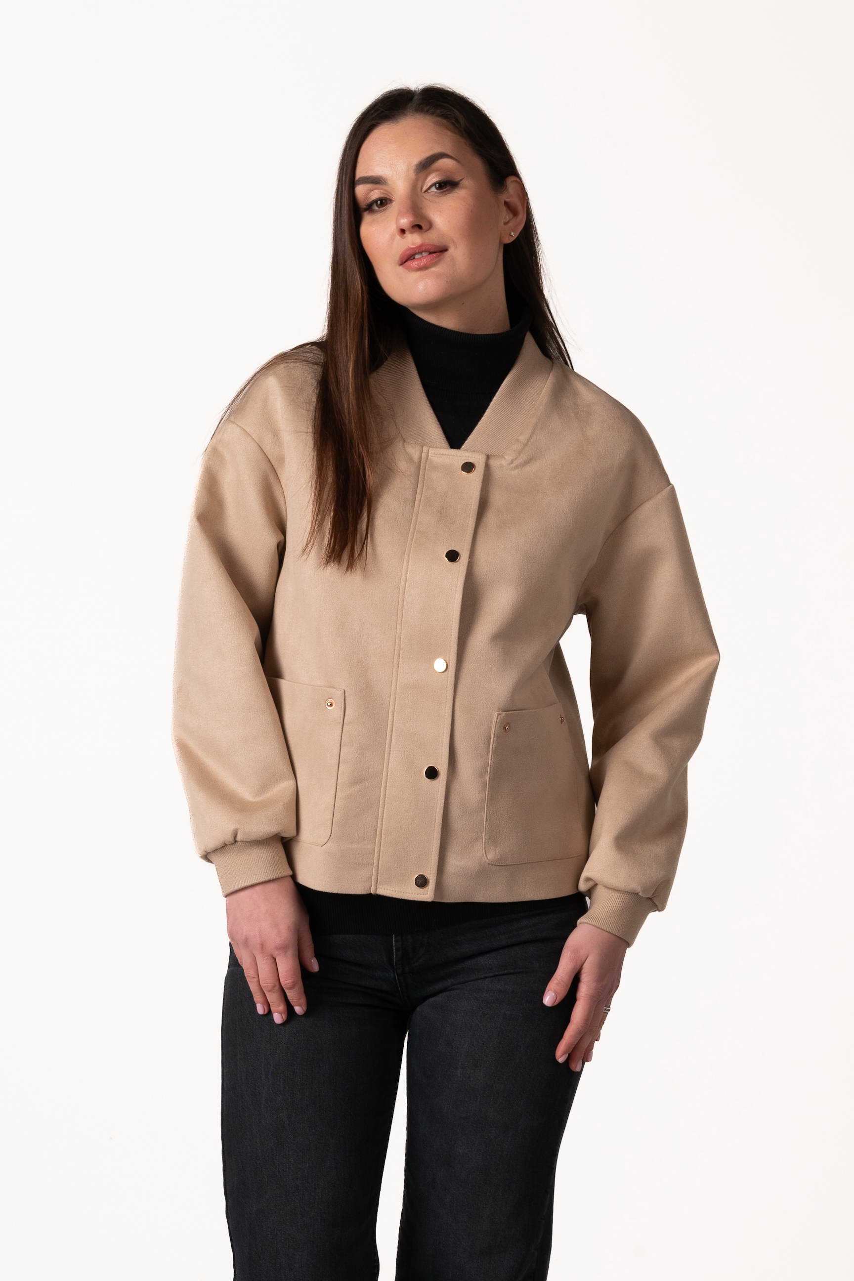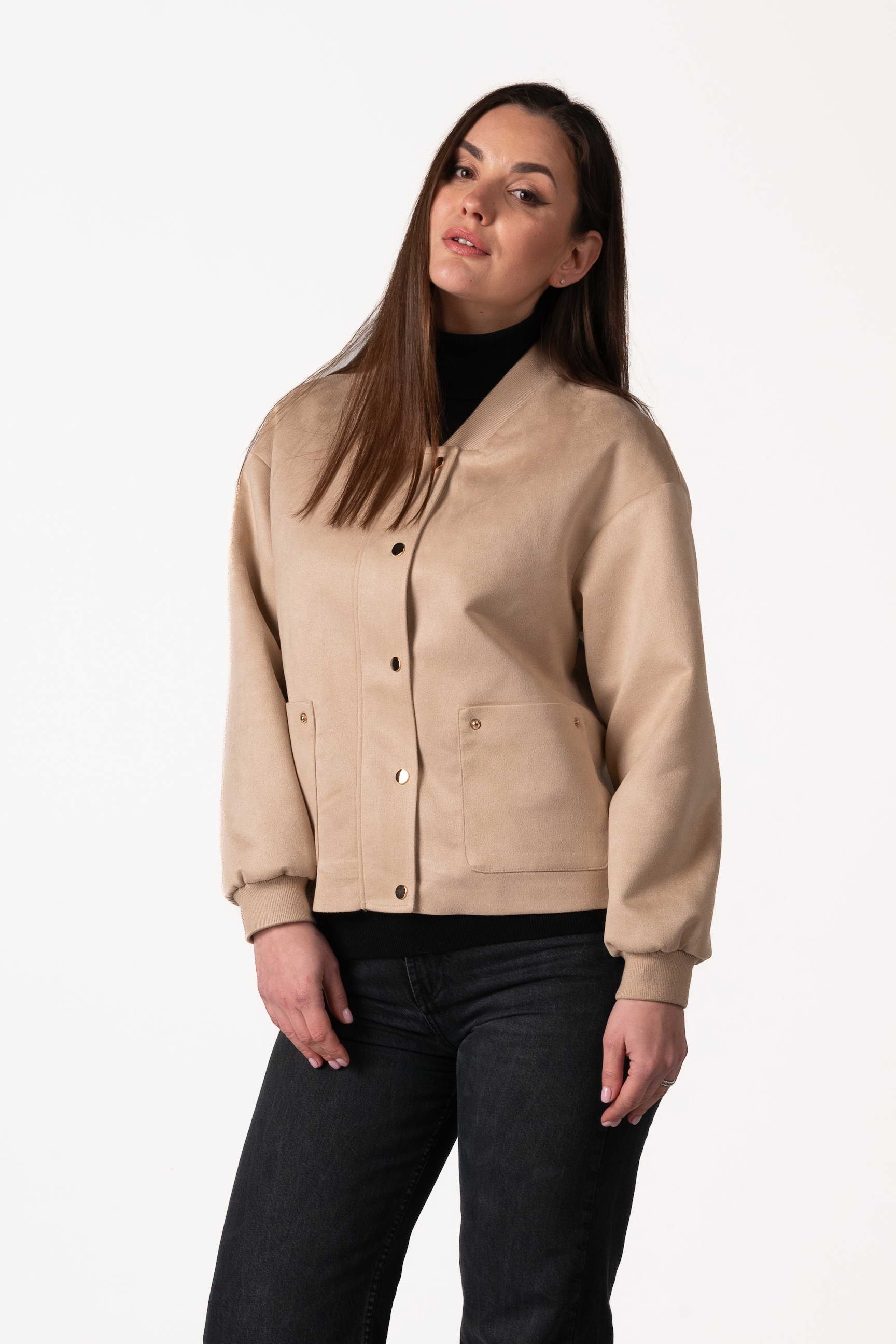 Куртка виготовлена з якісної штучної замші, яка приємна на дотик, має благородну текстуру та добре тримає форму. Матеріал зносостійкий і простий у догляді, що робить виріб зручним для щоденного використання.