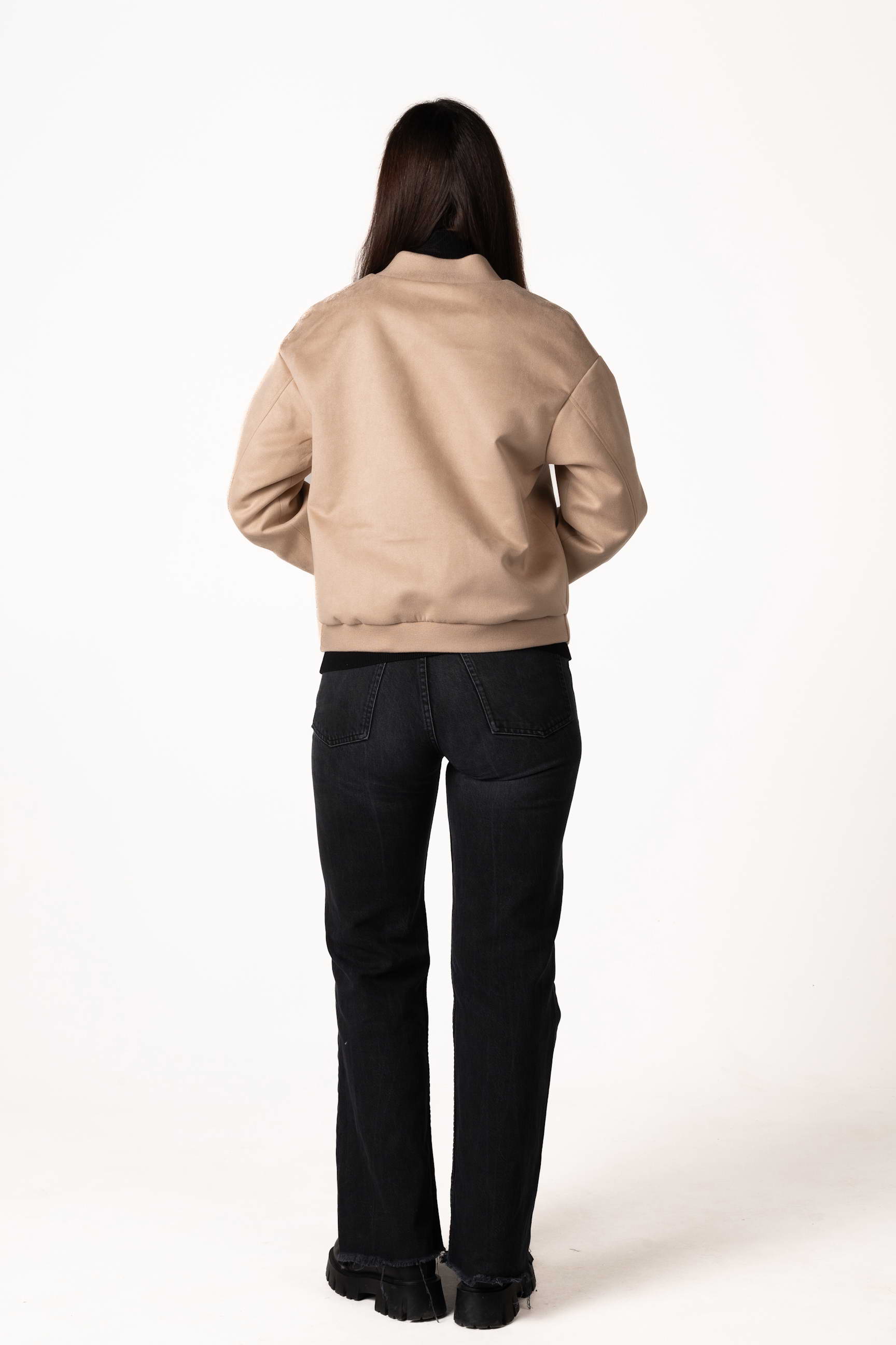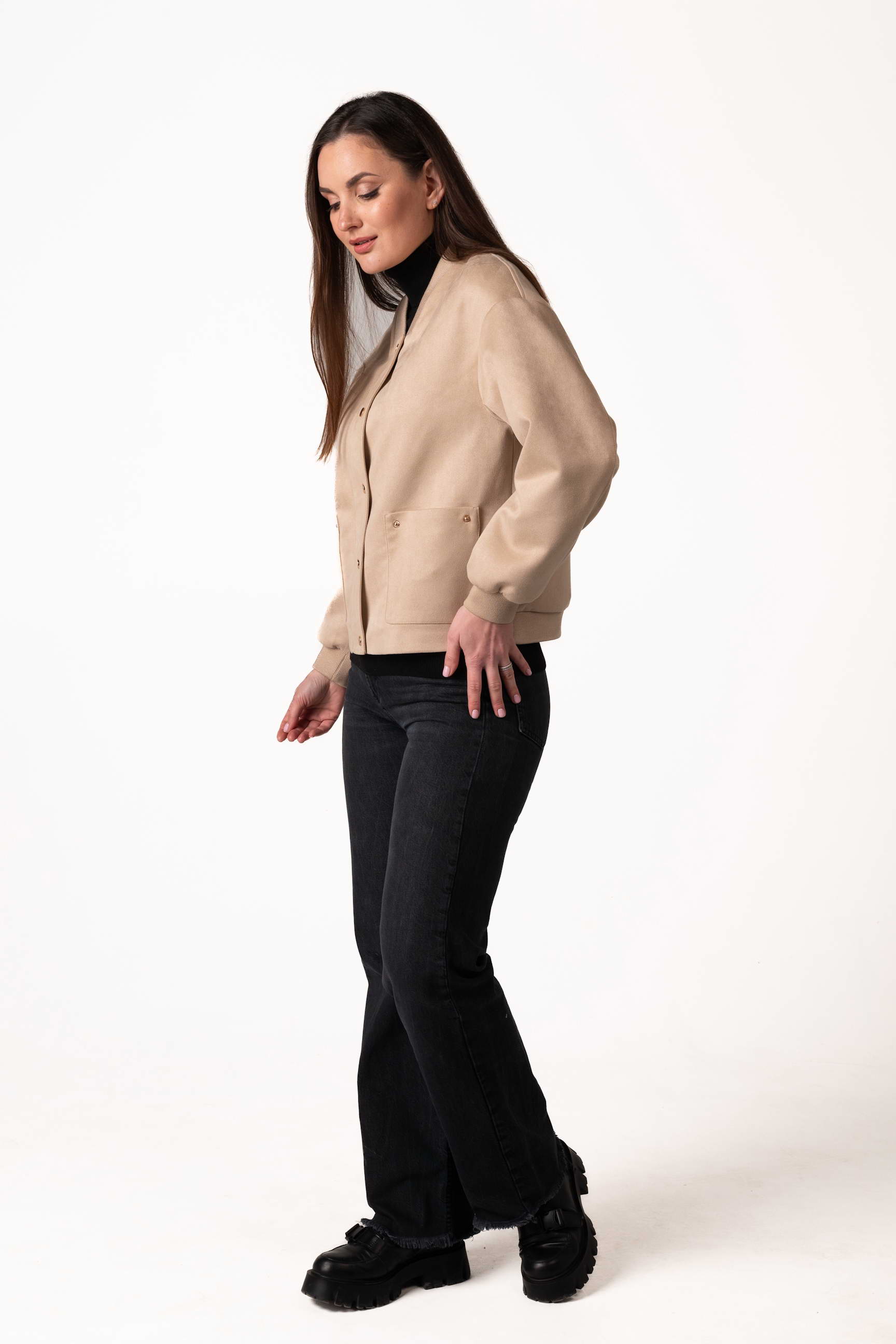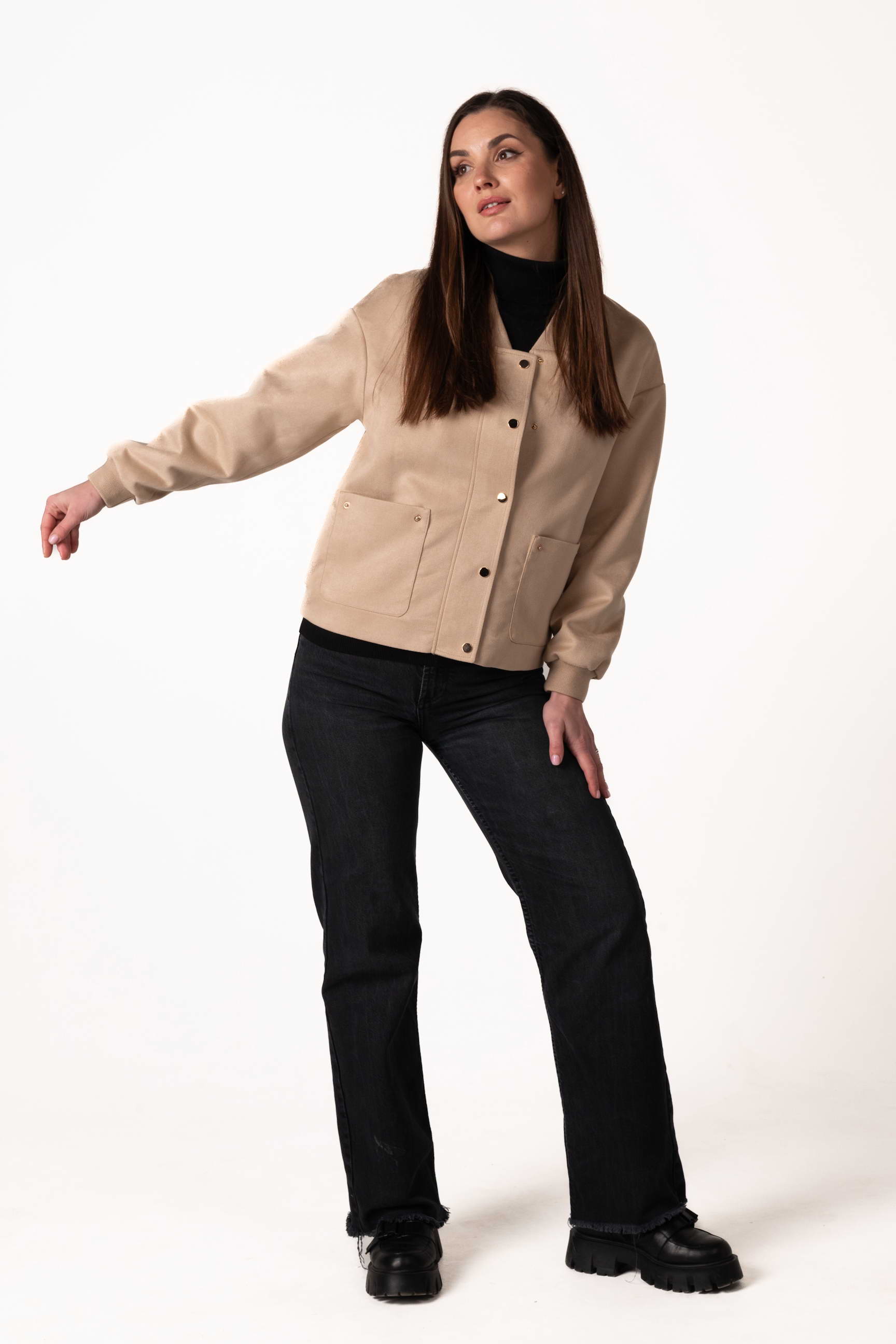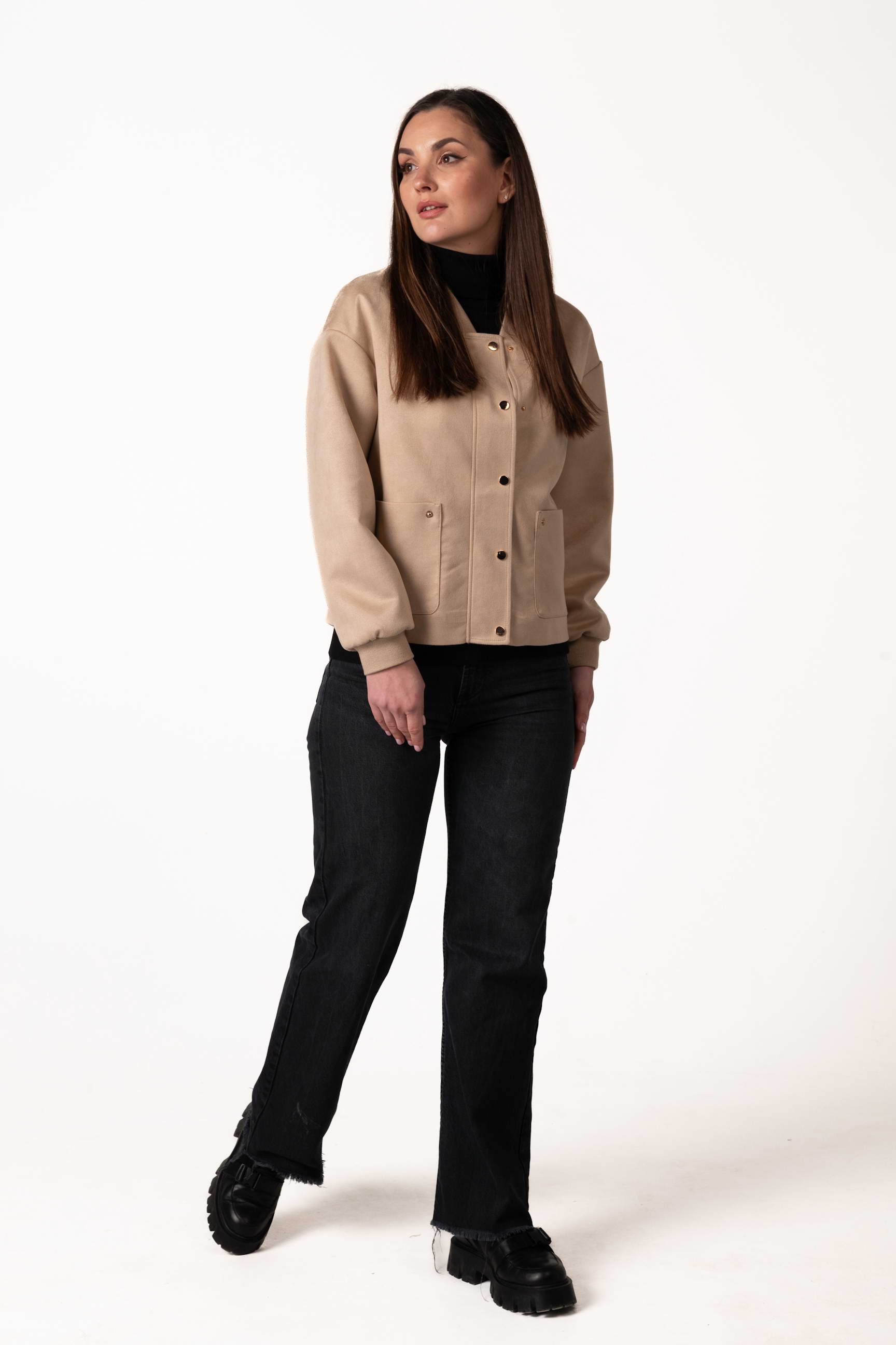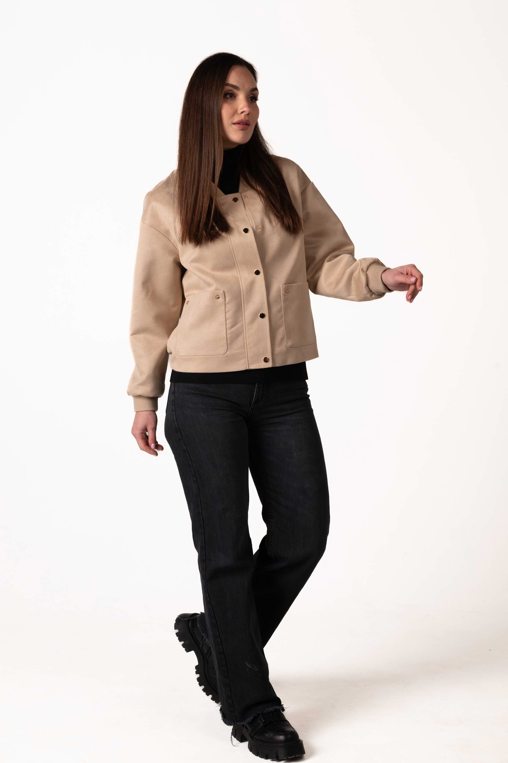 Куртка виготовлена з якісної штучної замші, яка приємна на дотик, має благородну текстуру та добре тримає форму. Матеріал зносостійкий і простий у догляді, що робить виріб зручним для щоденного використання.