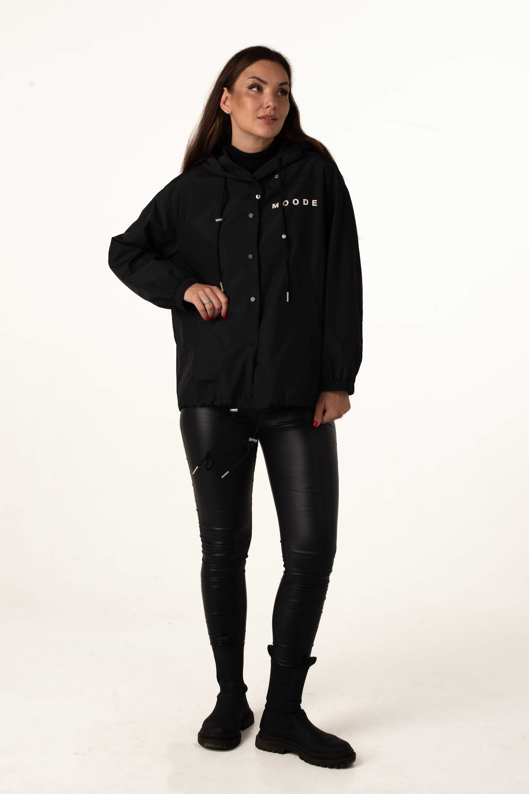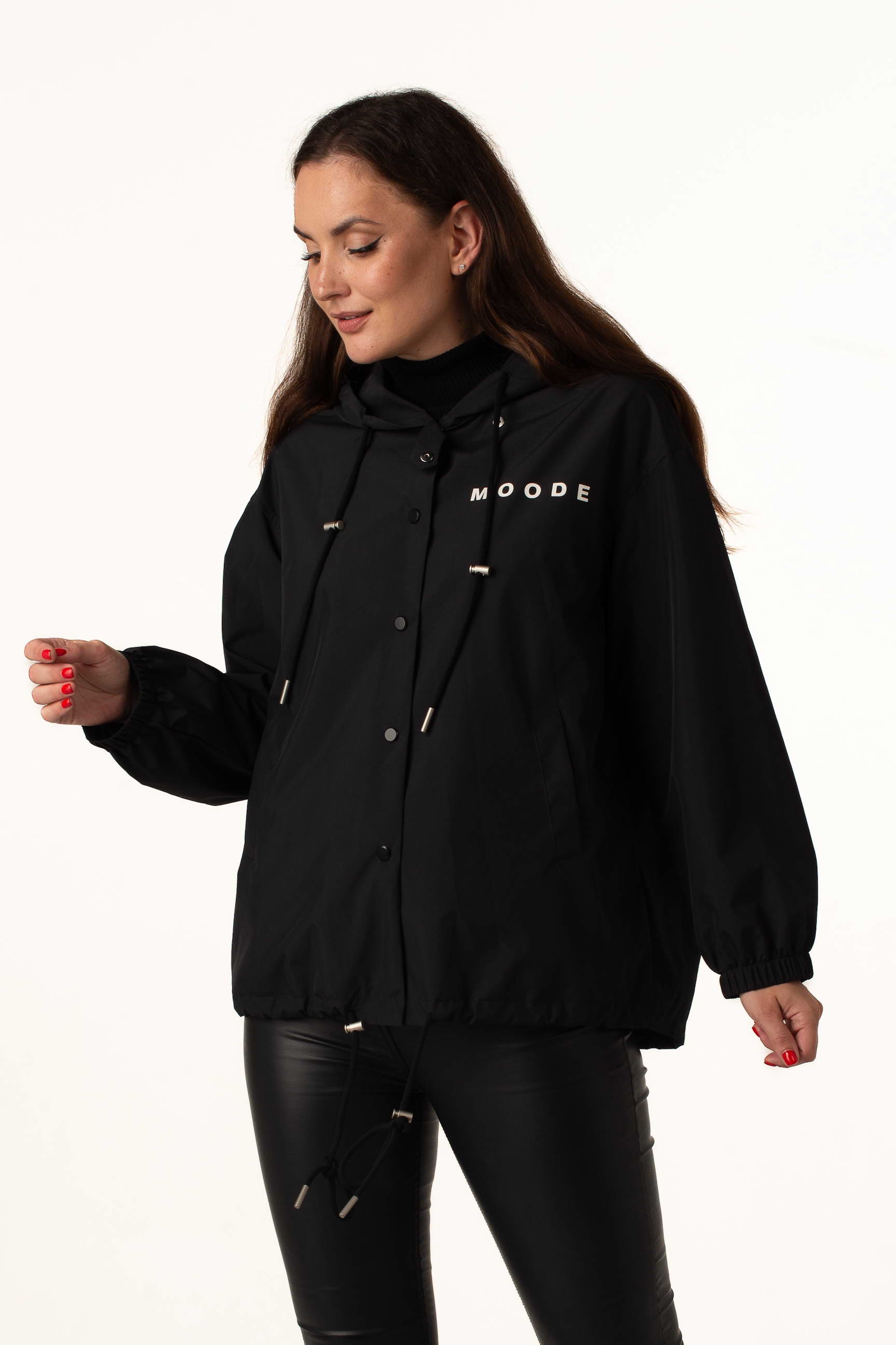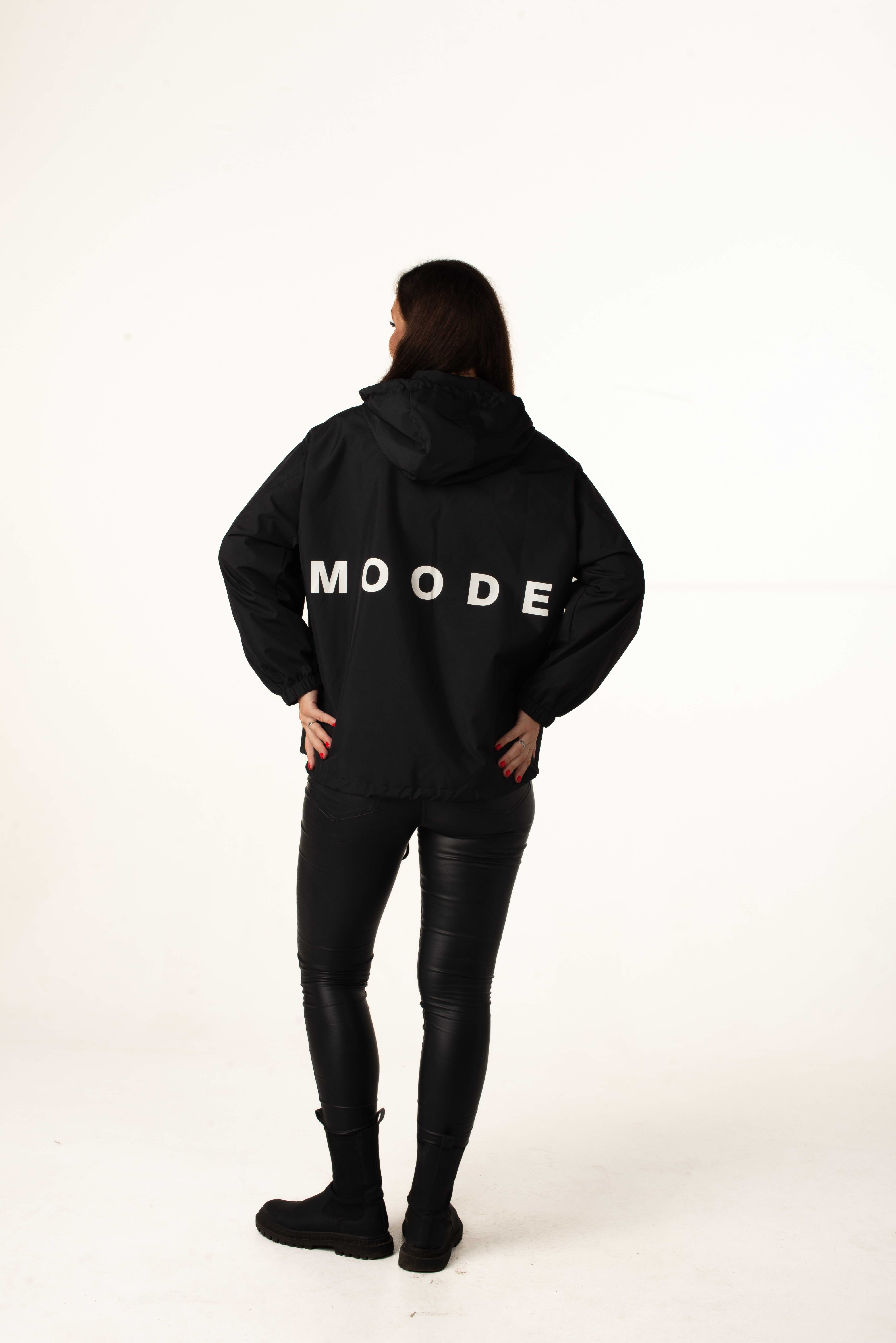Чорна жіноча легка вітровка ідеальна для теплої весни та осені. Модель поєднує стильний дизайн, практичність і комфорт, а капюшон і куліска по низу забезпечують захист від вітру. Написи на грудях і спині додають сучасного і модного вигляду.