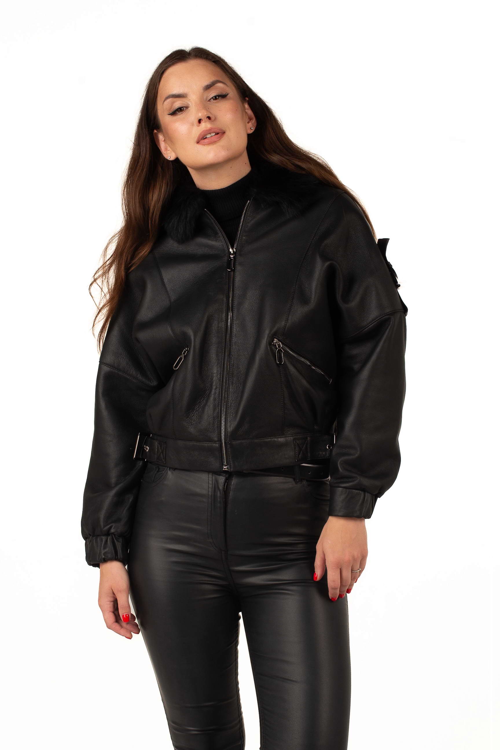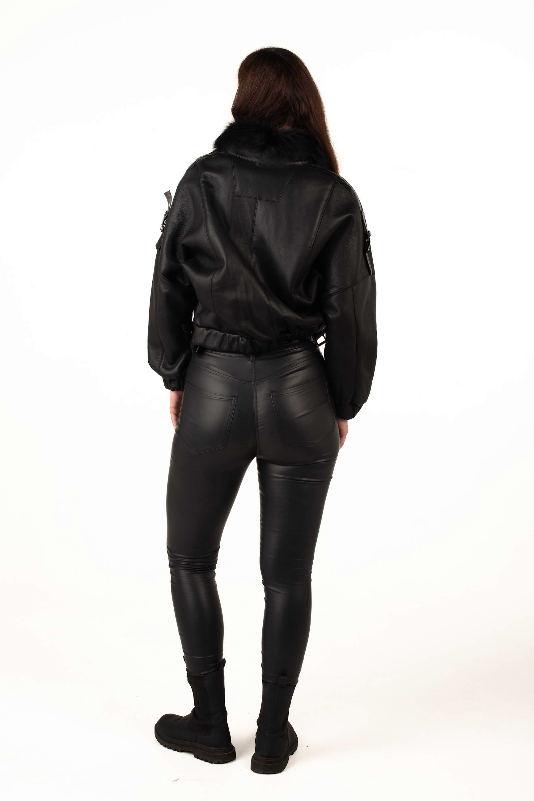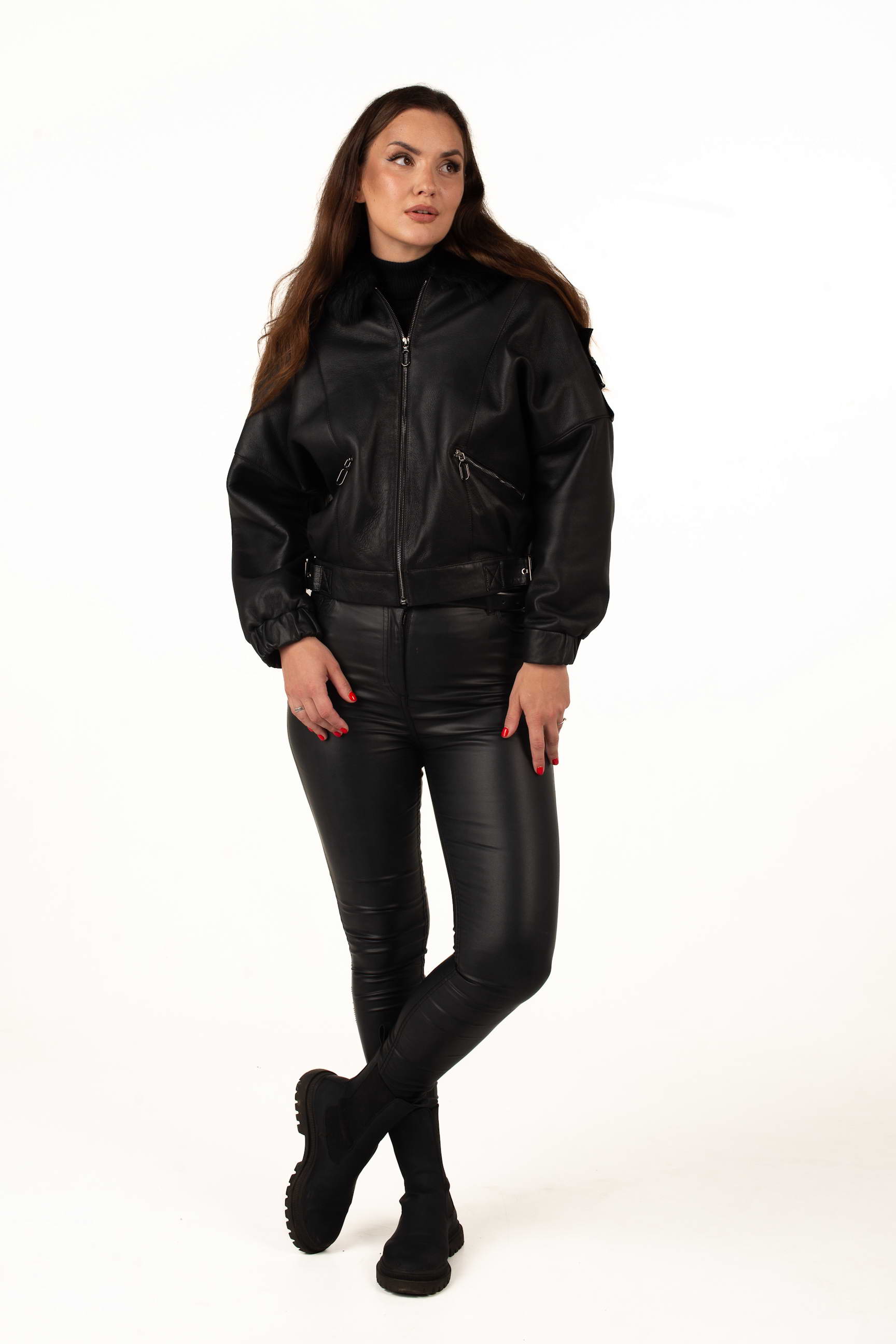 Жіночий бомбер з овчини чорного кольору поєднує стиль, тепло та функціональність, забезпечуючи комфорт і практичність у холодну пору року.