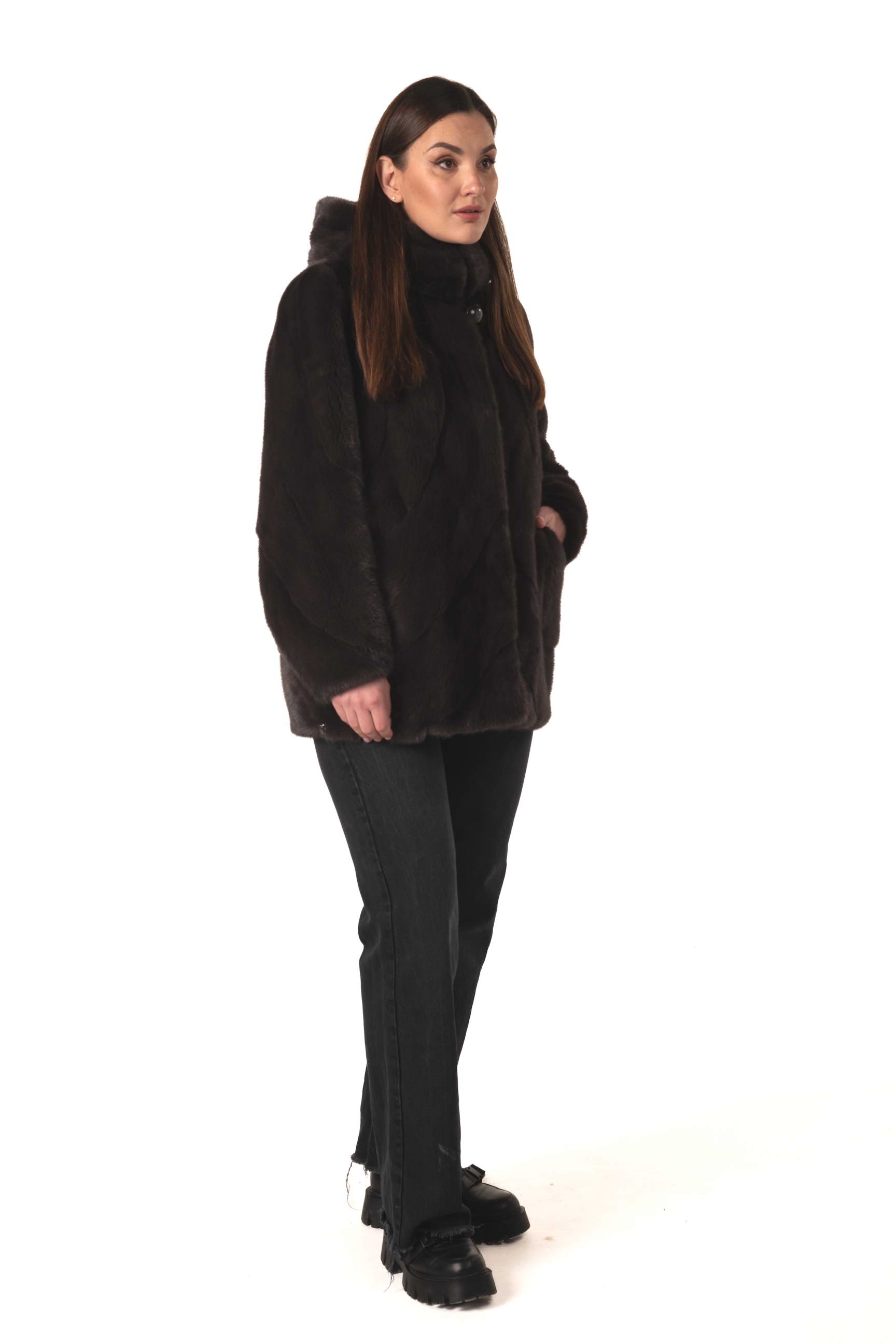 Коричневий колір надає шубі класичної елегантності та універсальності, підходить для будь-якого гардеробу та будь-яких образів, створюючи презентабельний і стильний вигляд.