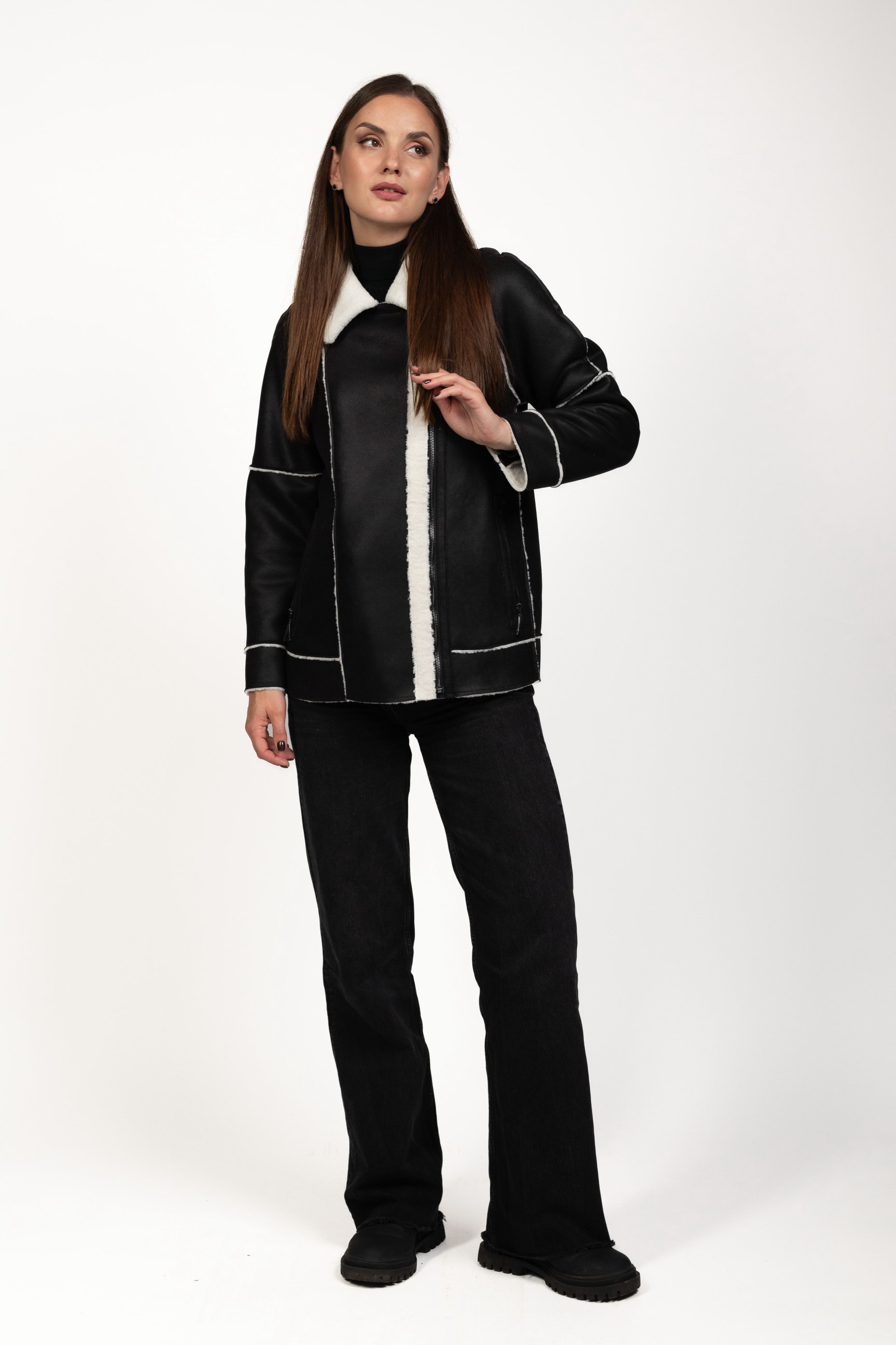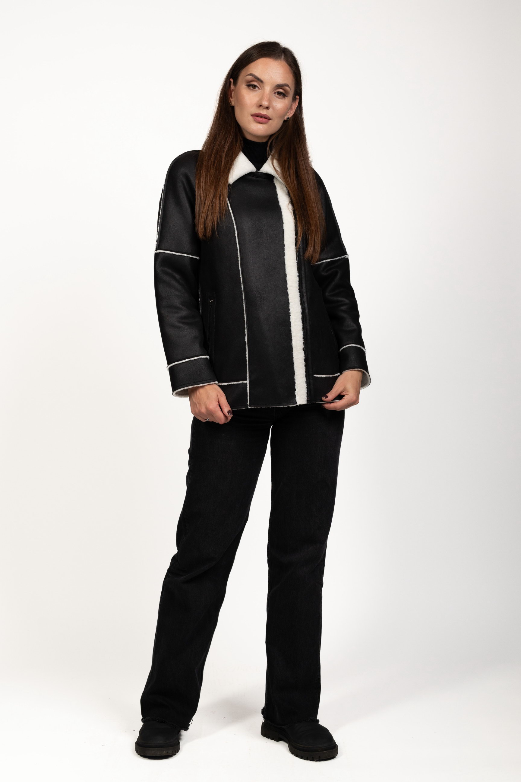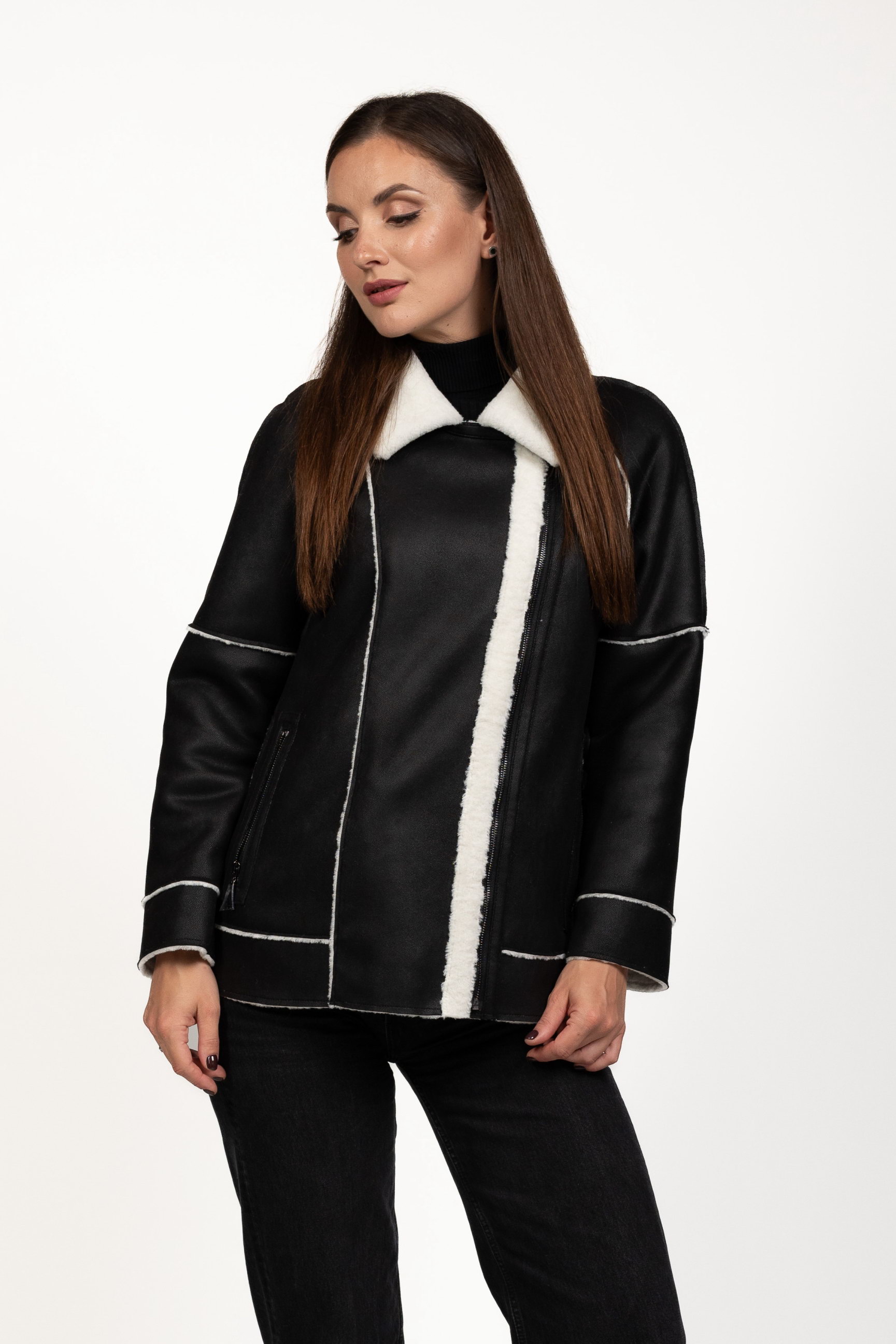Чорно-білий — ефектне контрастне поєднання, яке привертає увагу та робить образ виразним. Така дублянка стане стильним акцентом зимового гардеробу.