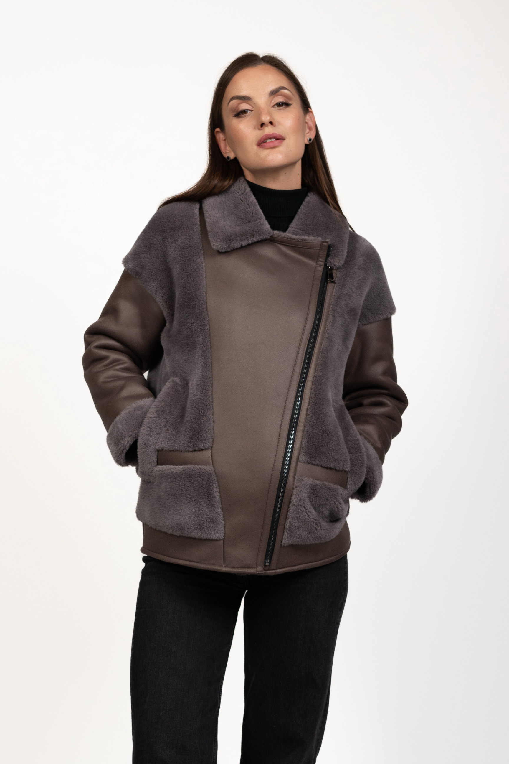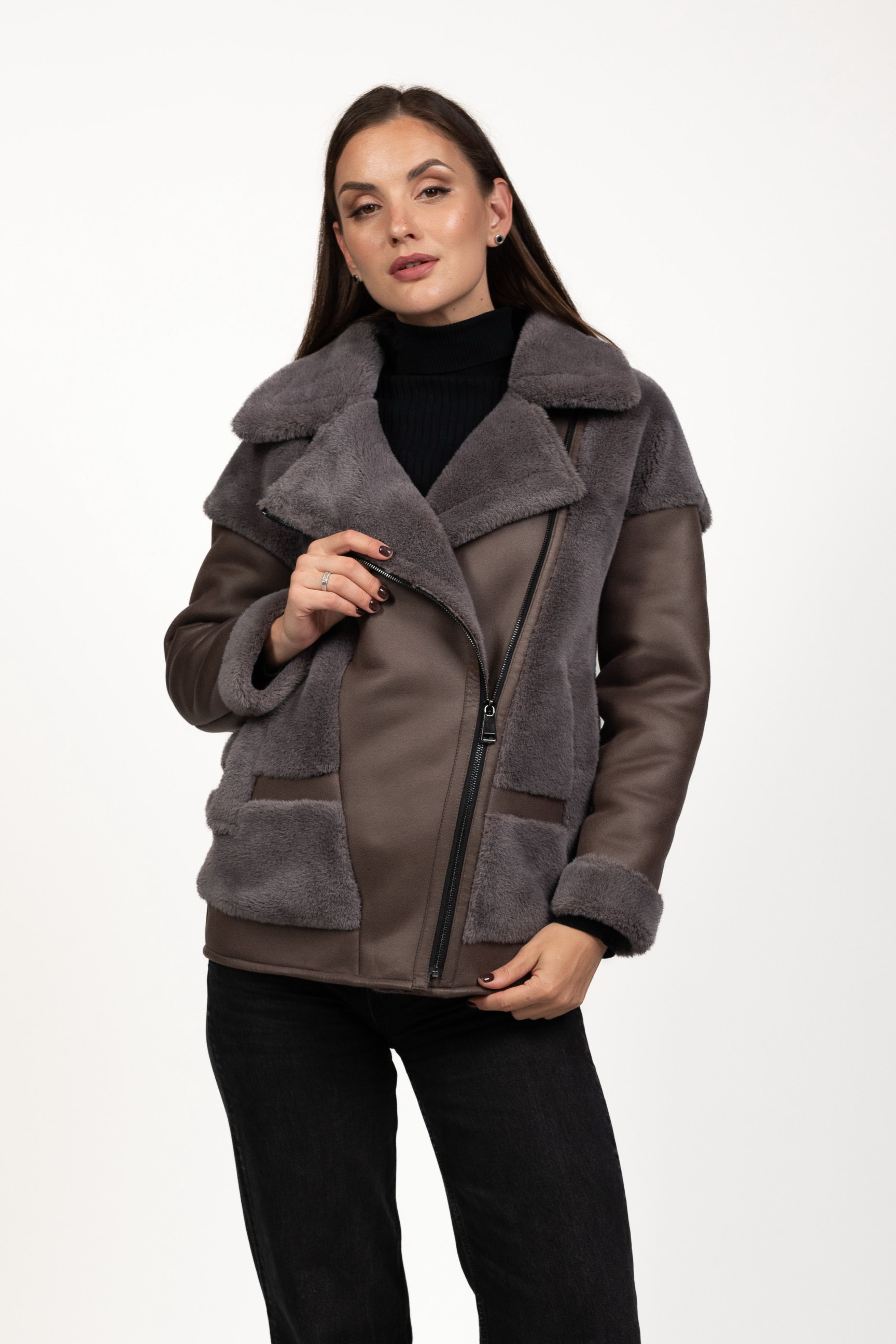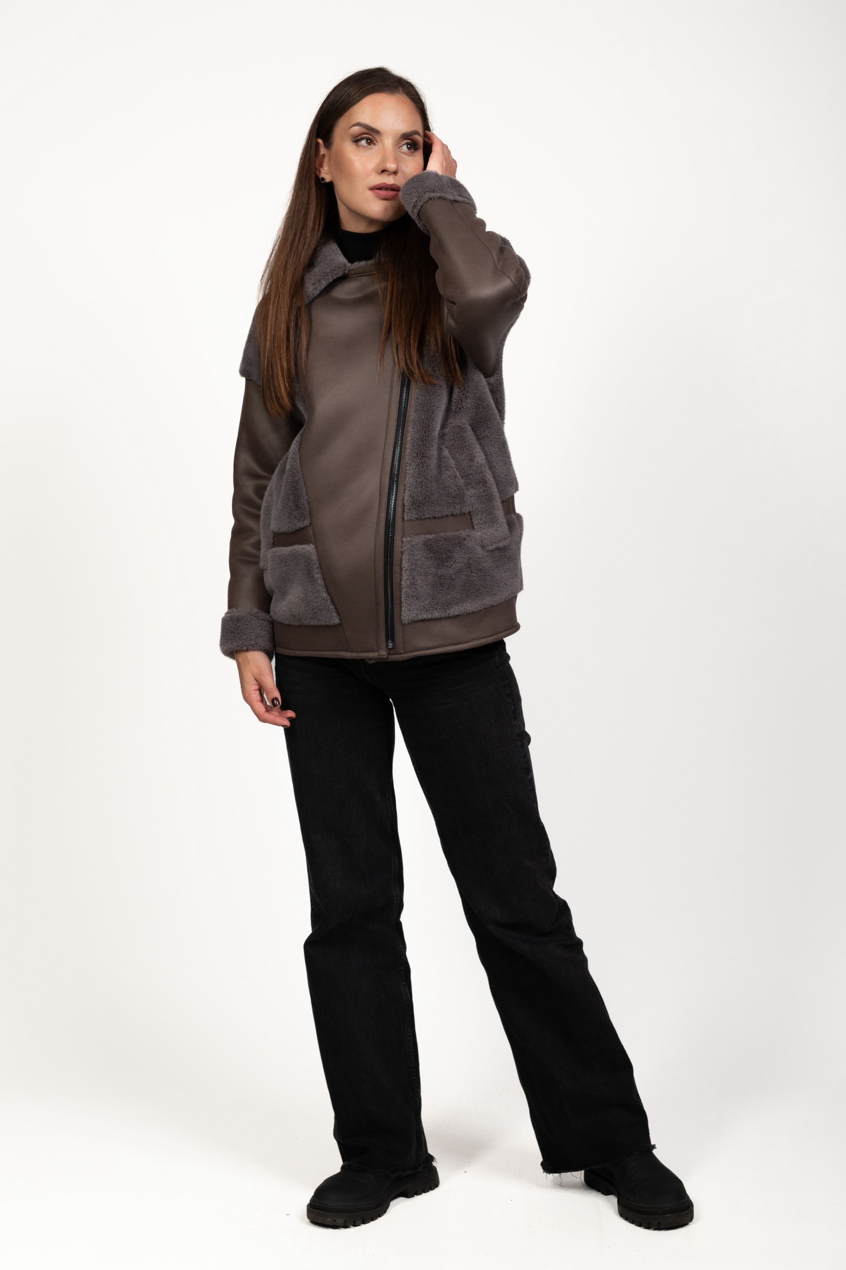 Жіноча штучна дублянка темно-коричнева – стильна зимова класика з косою блискавкою