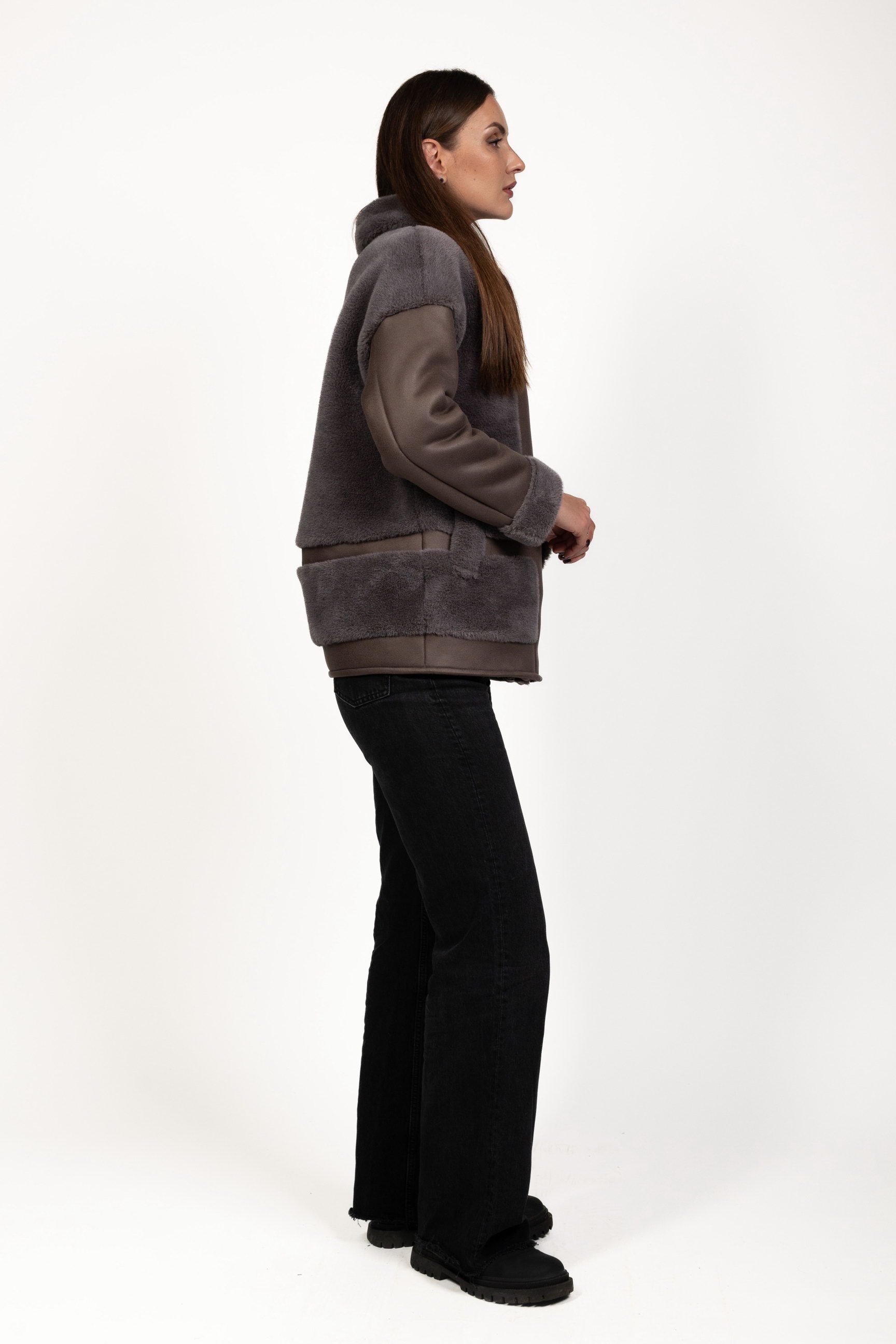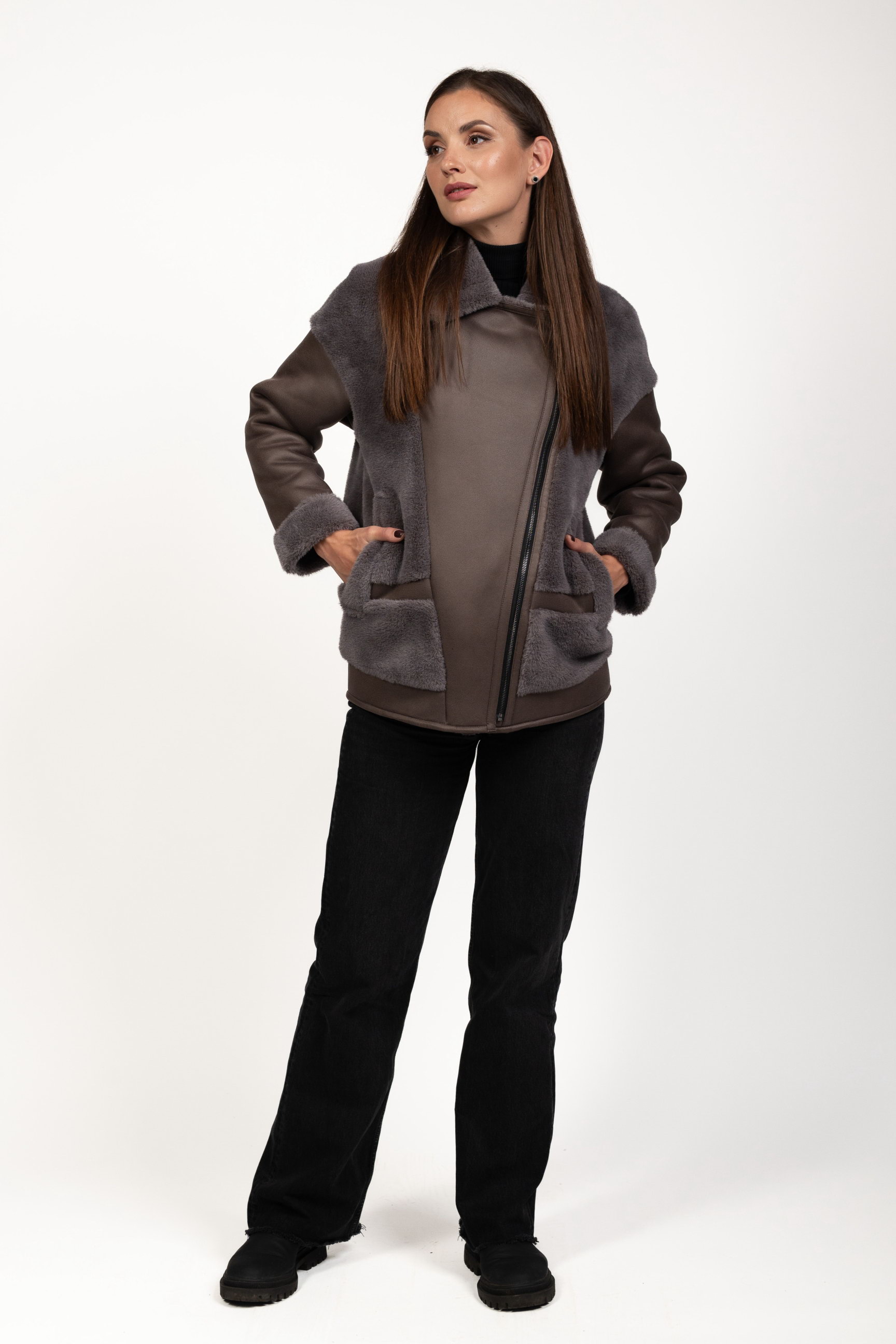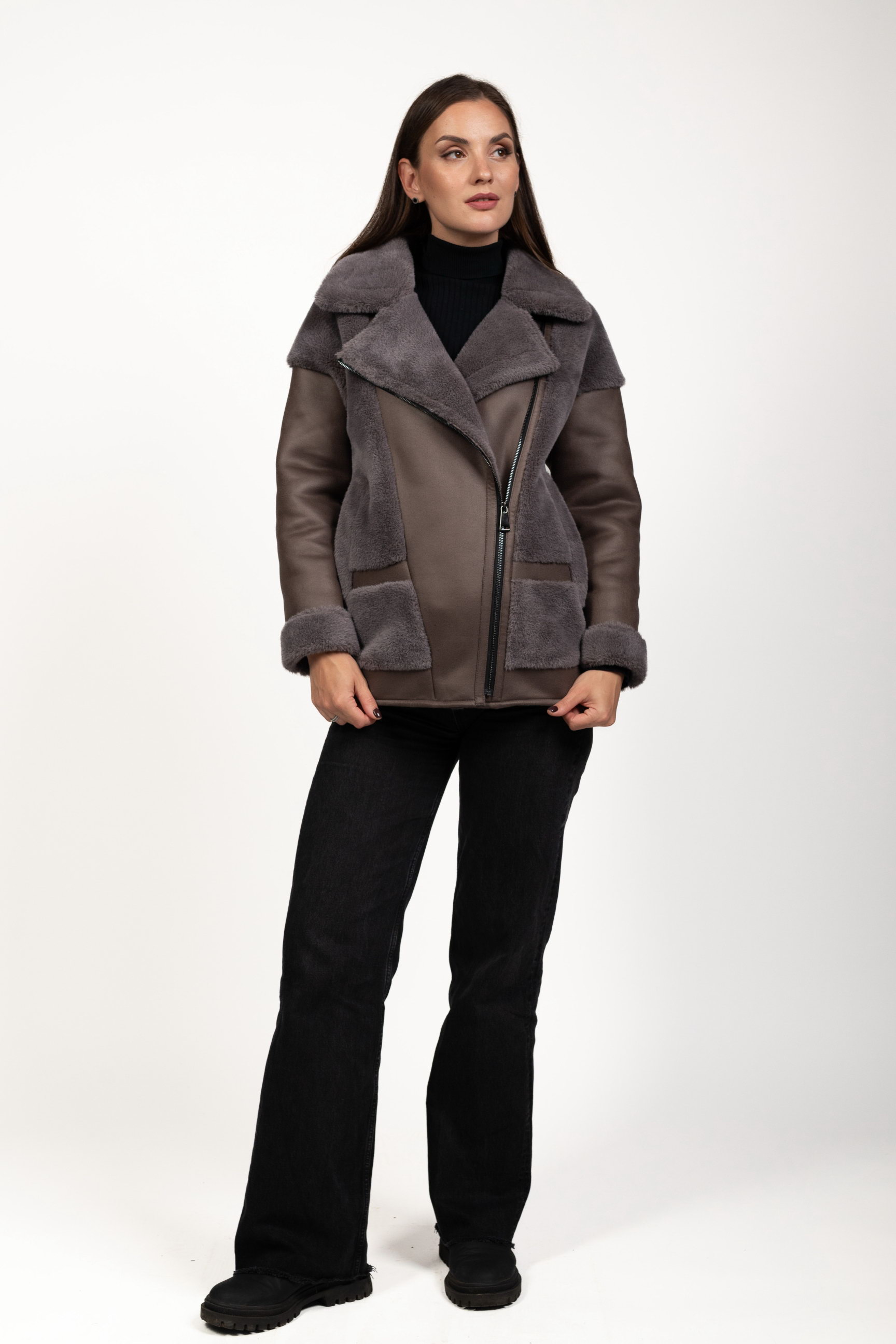 Жіноча штучна дублянка темно-коричнева – стильна зимова класика з косою блискавкою