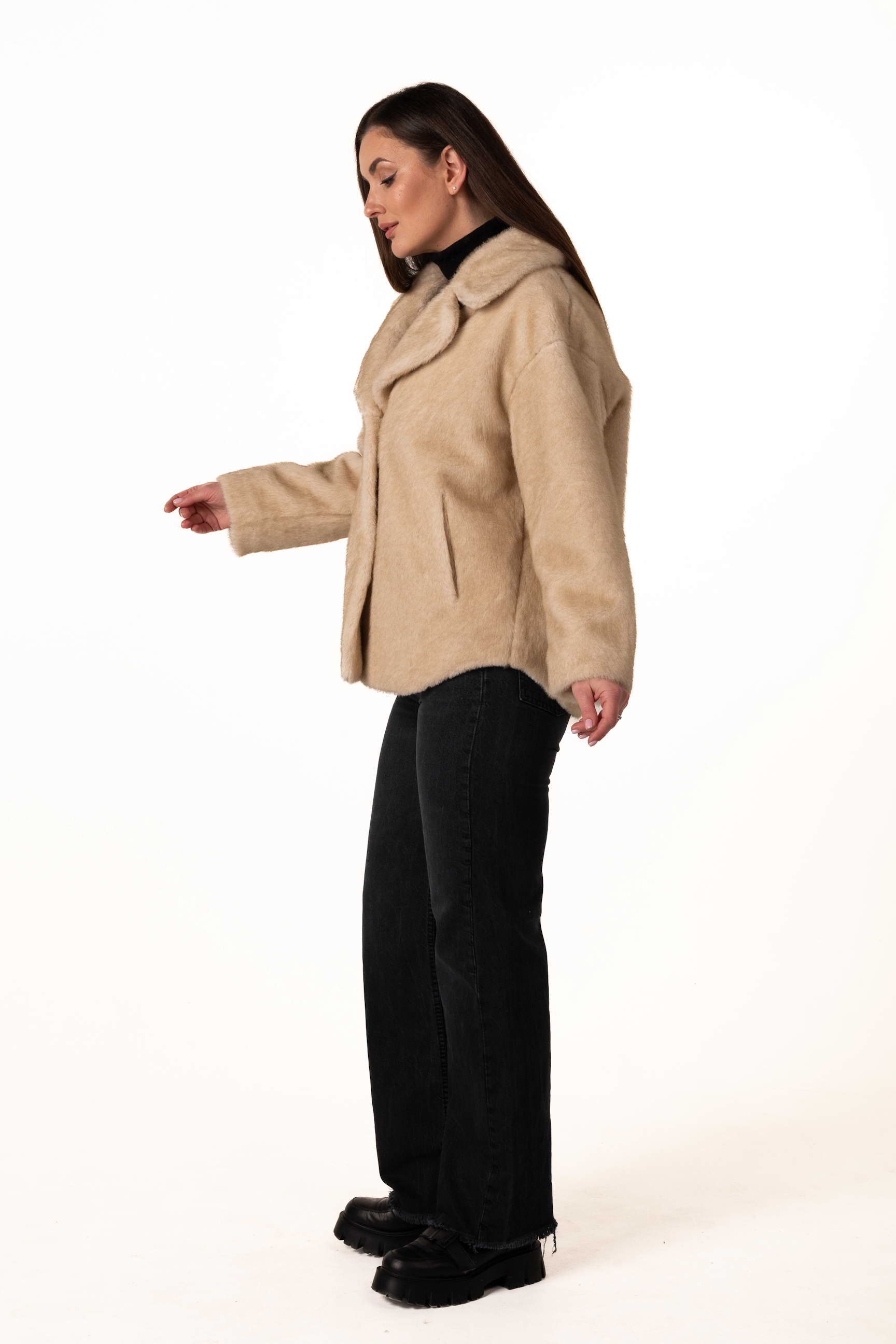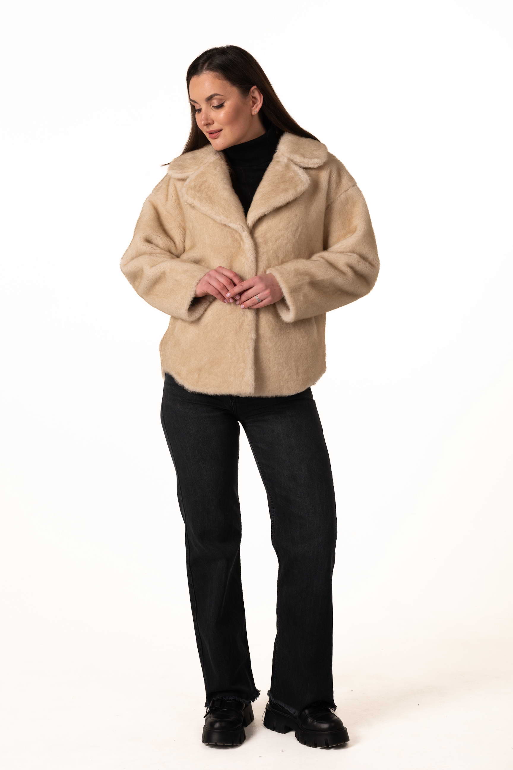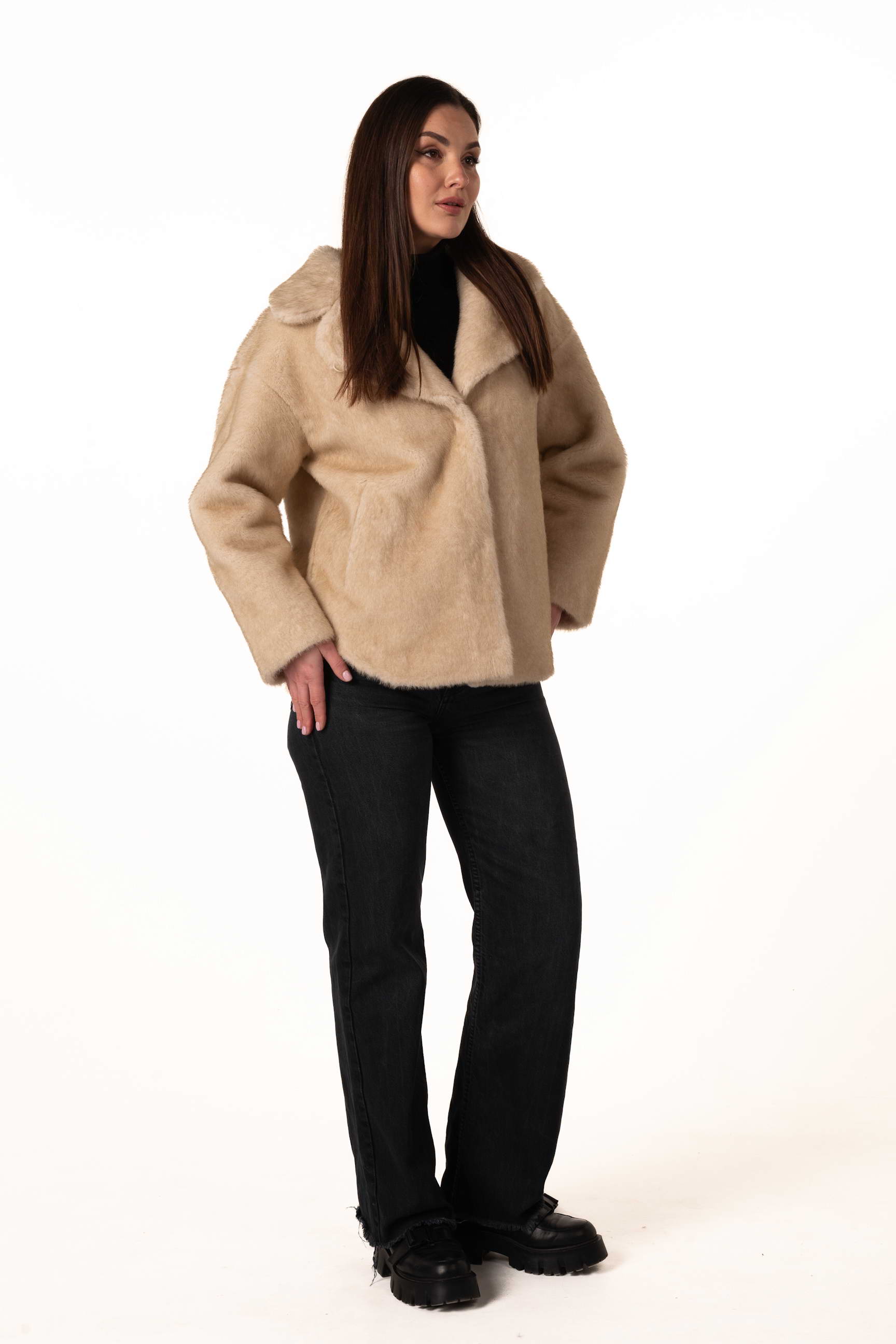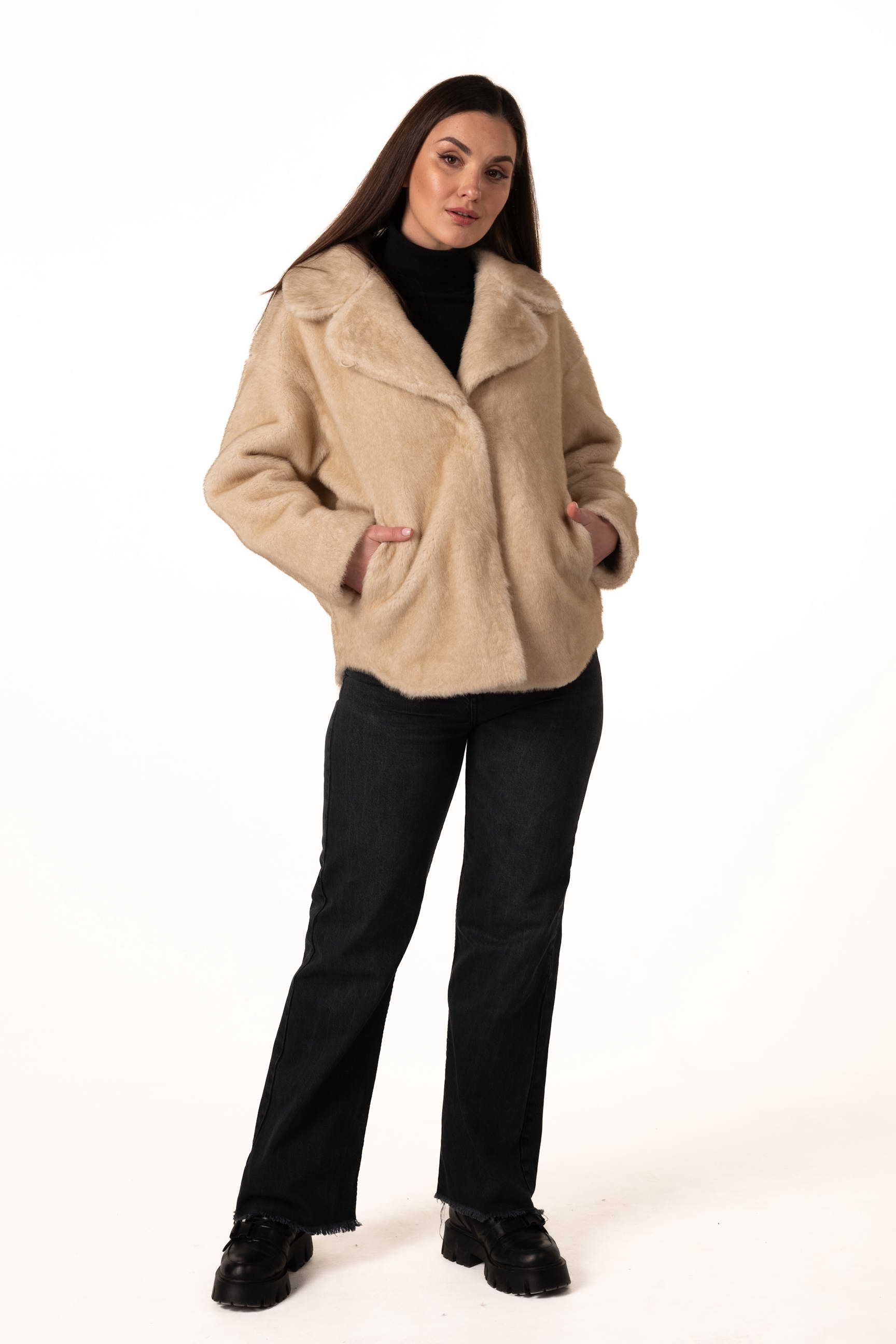 Функціональні бокові кишені дозволяють зручно зберігати дрібні речі або зігрівати руки у холодні дні. Довжина 73 см робить модель універсальною та зручною для щоденного носіння — шуба не сковує рухів і чудово підходить для прогулянок, роботи та активного ритму міста.
