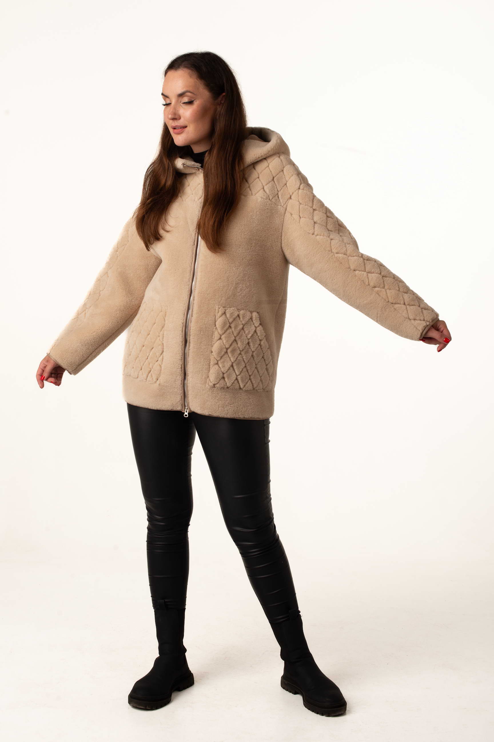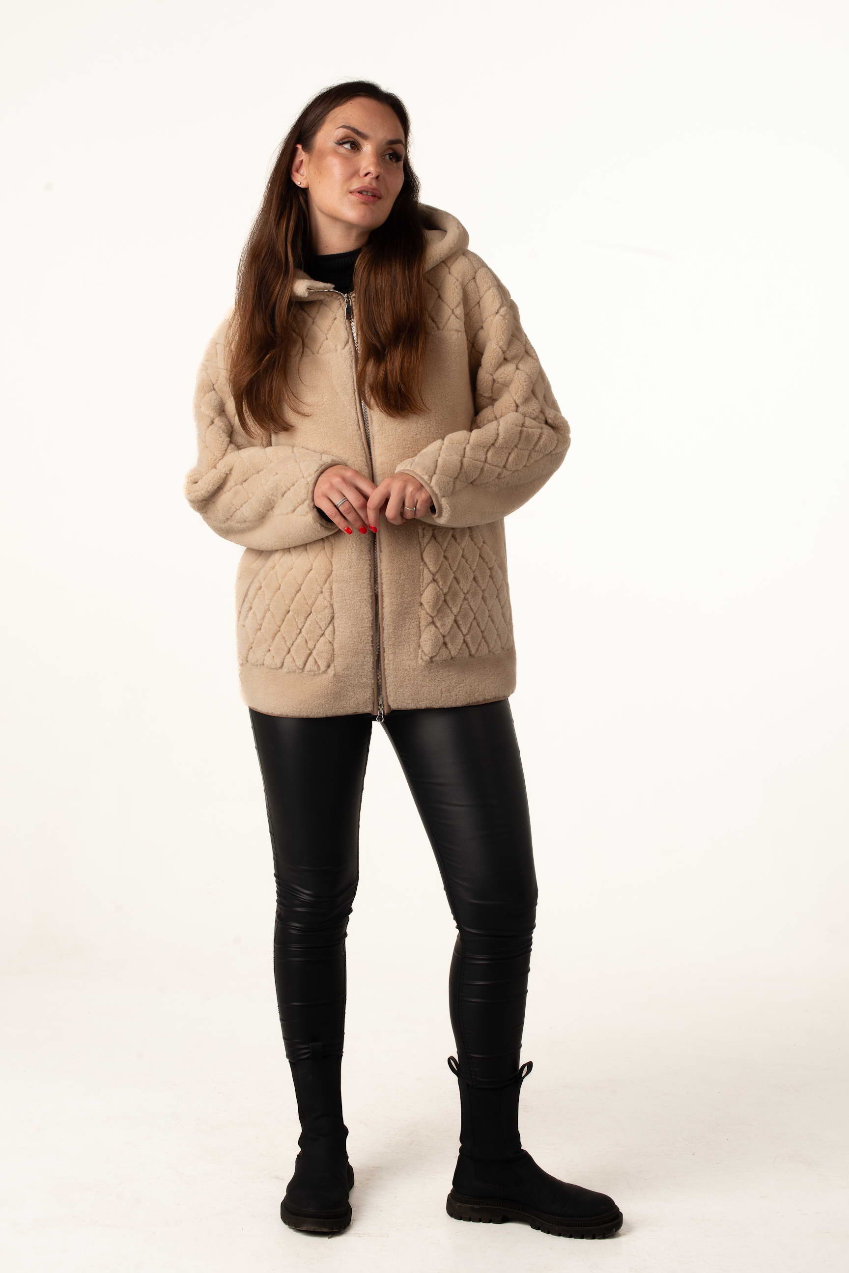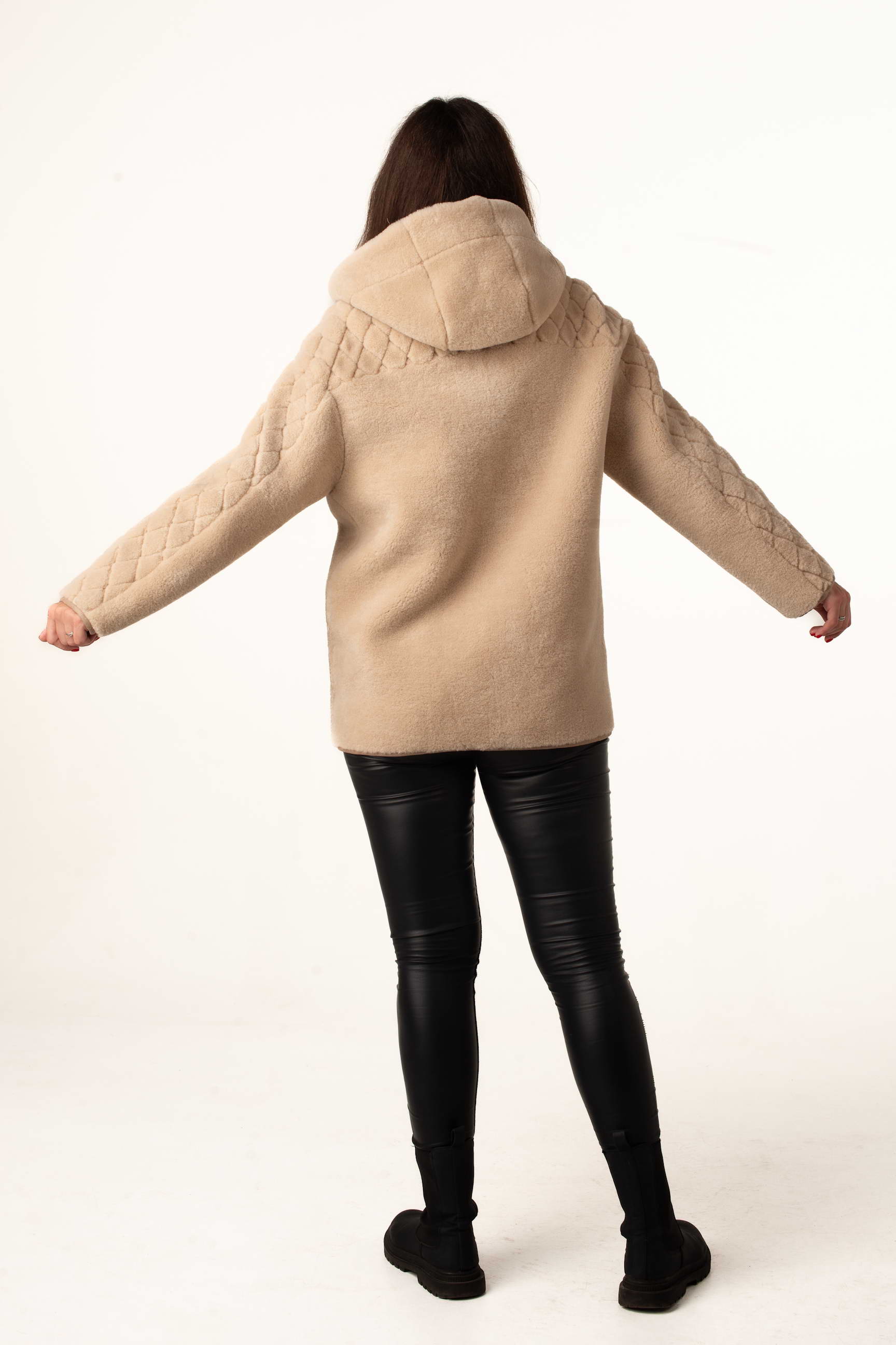 Жіноча шуба зі штучного хутра у ніжному бежевому відтінку поєднує комфорт, тепло та сучасний стиль. Модель оснащена коміром-стійкою з капюшоном, що захищає від вітру та холоду, а бокові кишені додають практичності для повсякденного носіння.