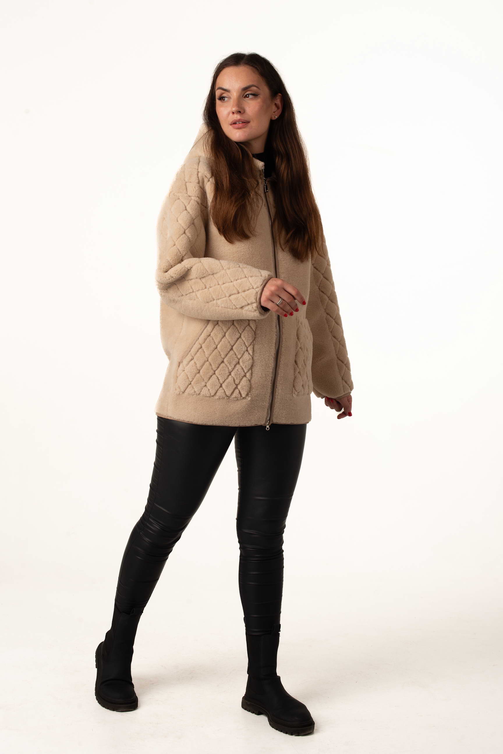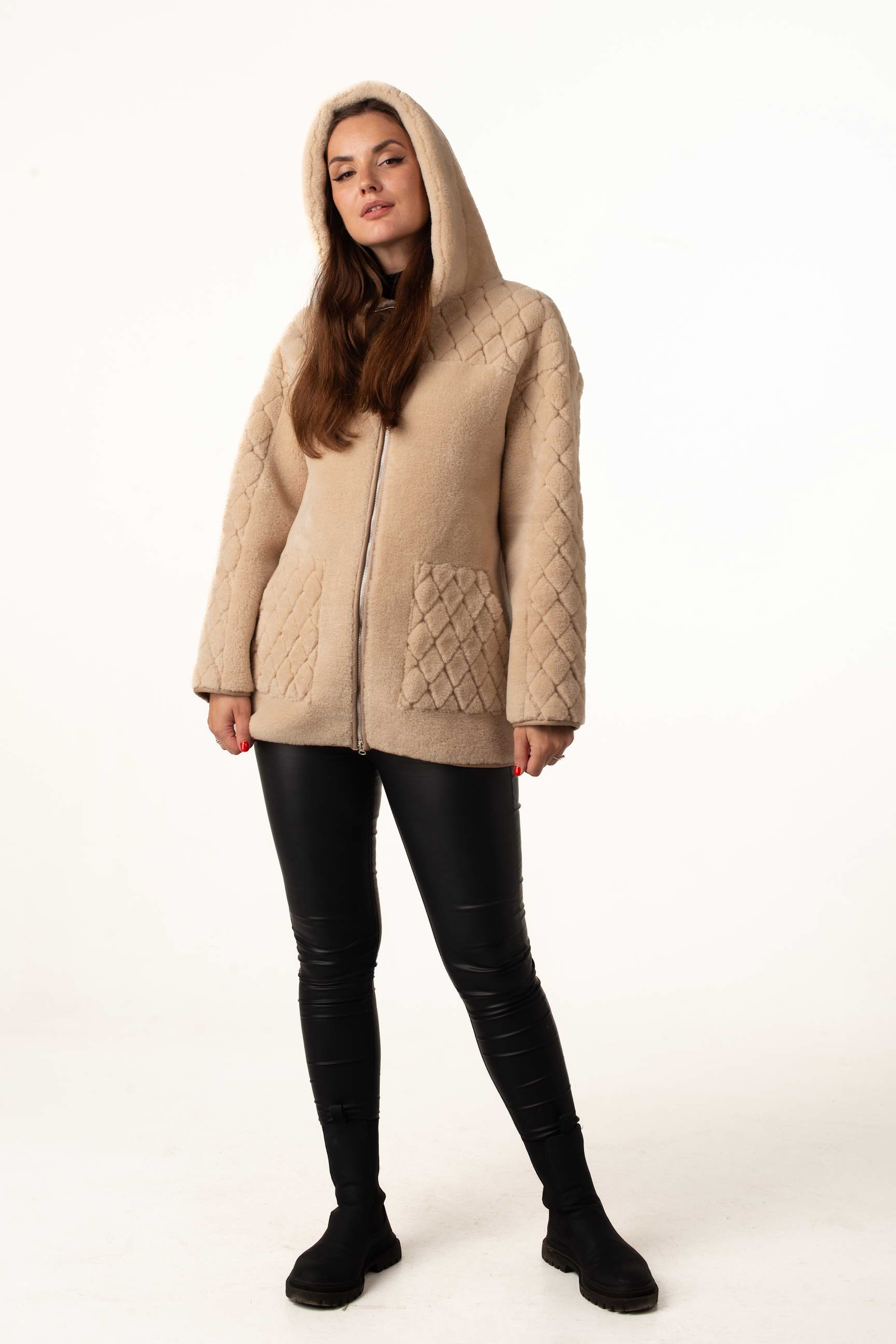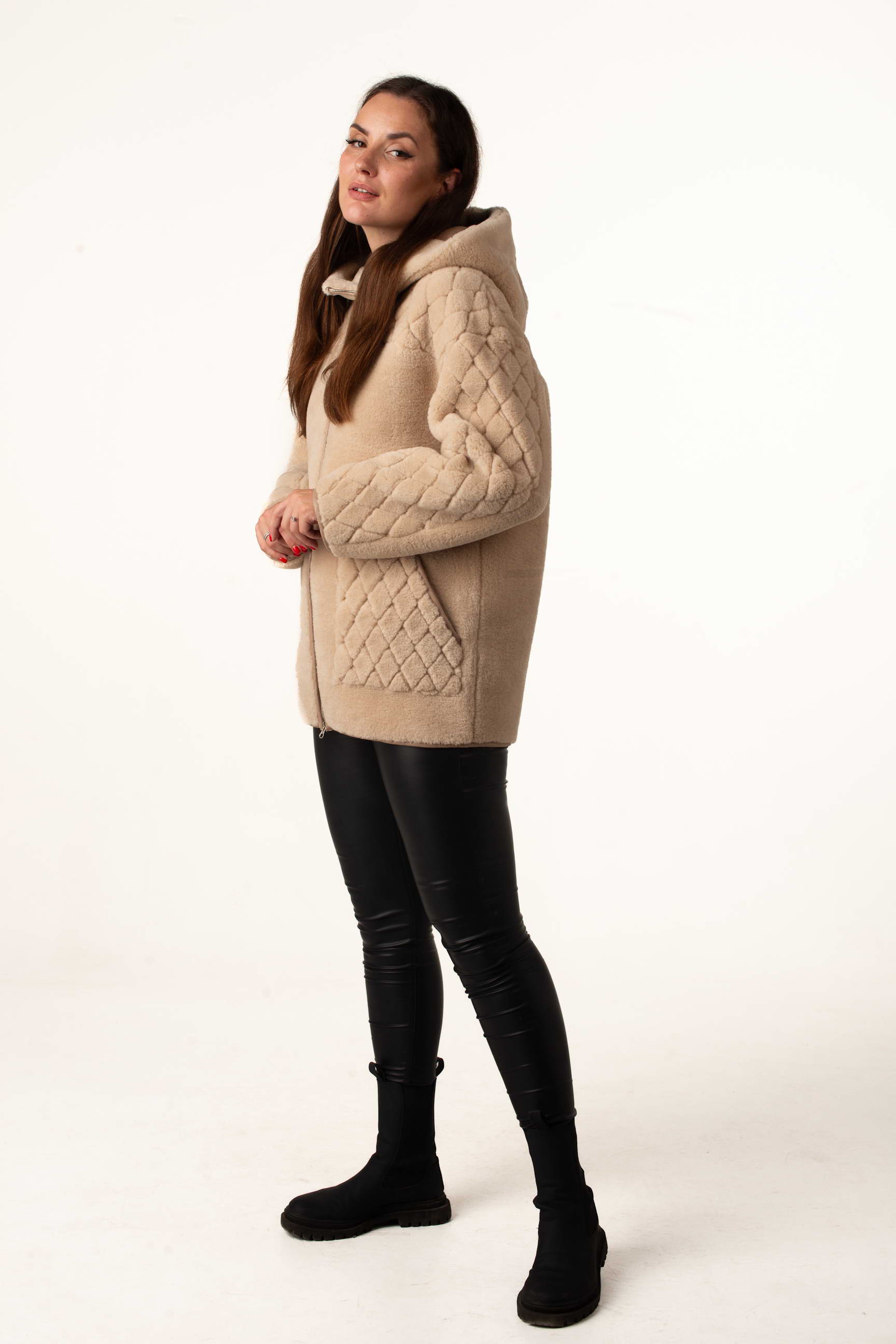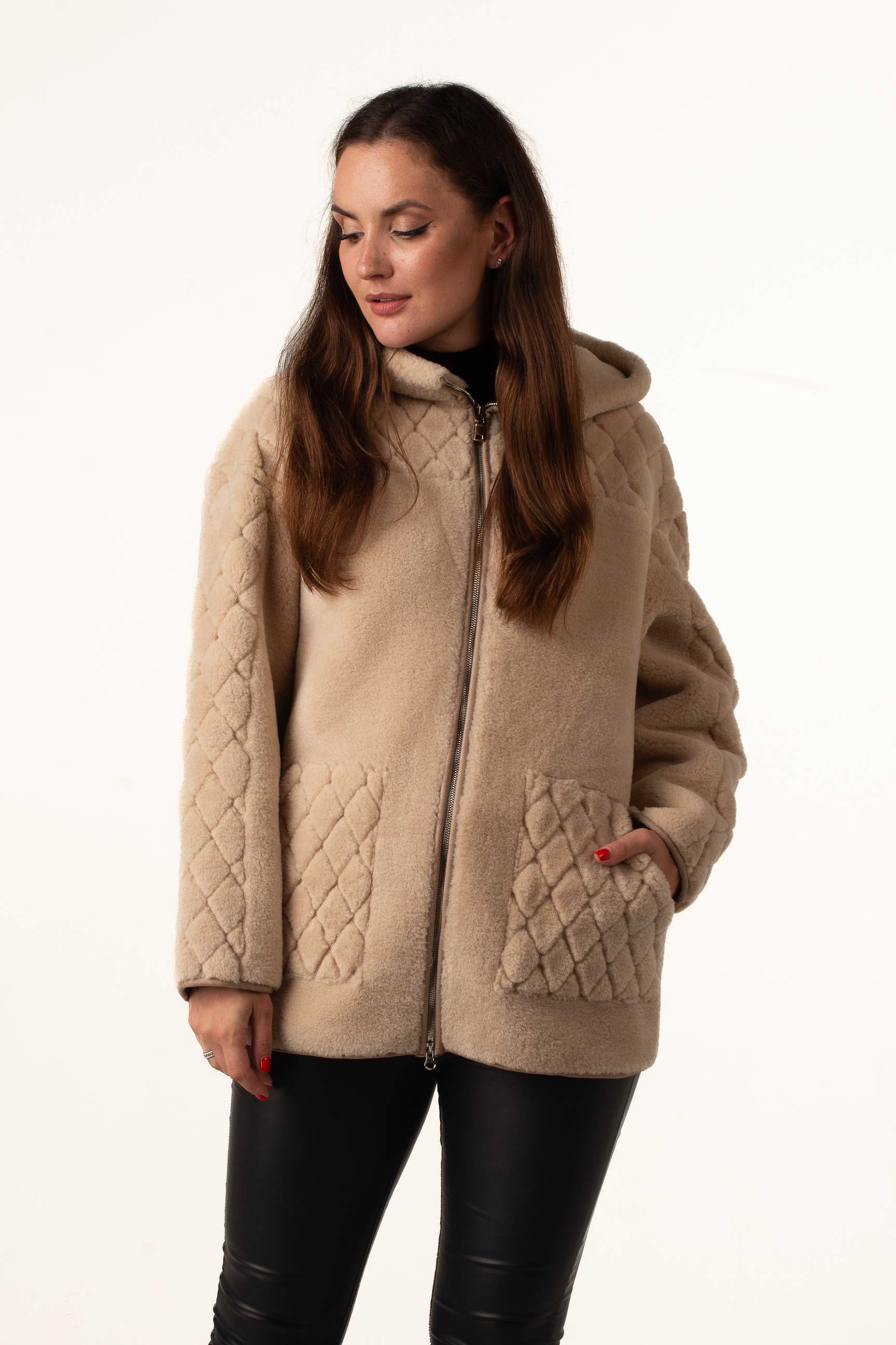 Жіноча шуба зі штучного хутра у ніжному бежевому відтінку поєднує комфорт, тепло та сучасний стиль. Модель оснащена коміром-стійкою з капюшоном, що захищає від вітру та холоду, а бокові кишені додають практичності для повсякденного носіння.