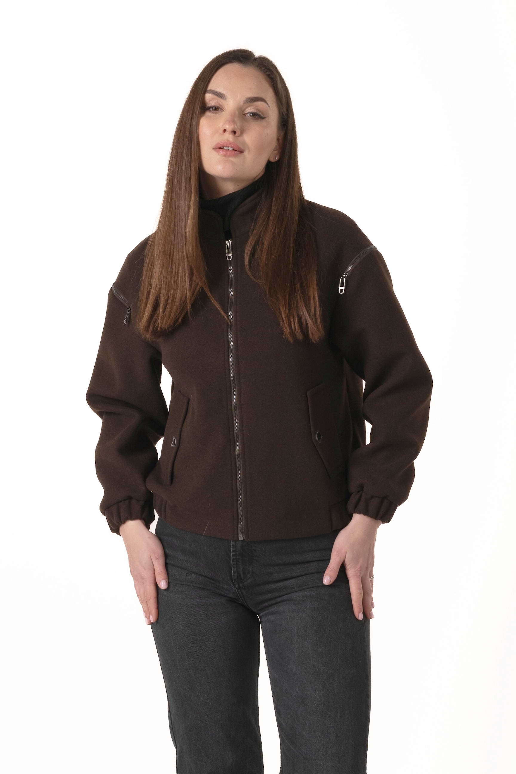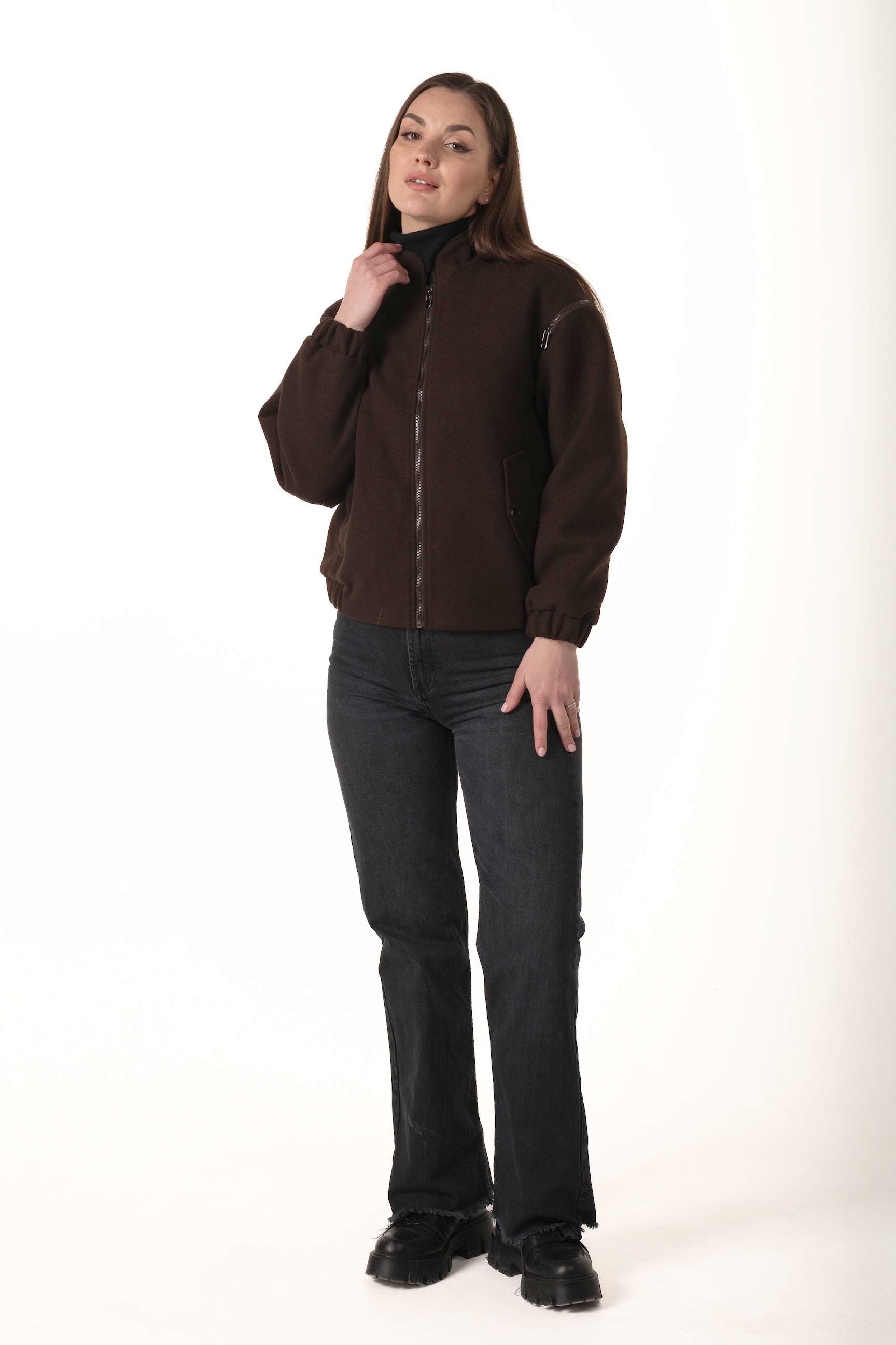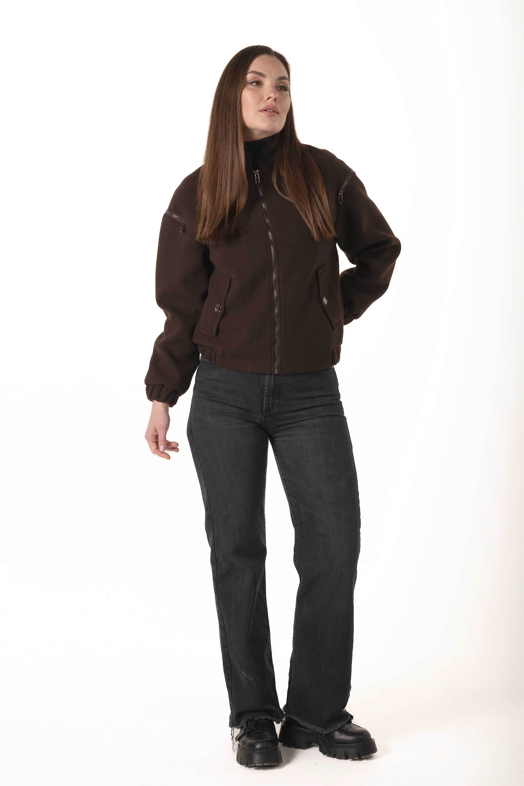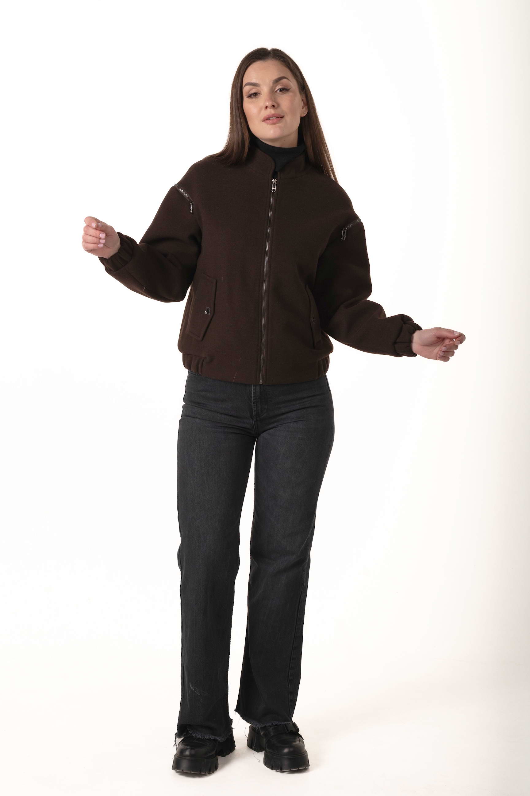 Силует-бомбер і довжина 62 см створюють сучасний образ, підкреслюючи стиль та свободу рухів. Коричневий колір додає елегантності та універсальності, поєднується з будь-яким гардеробом і підходить для щоденного носіння.