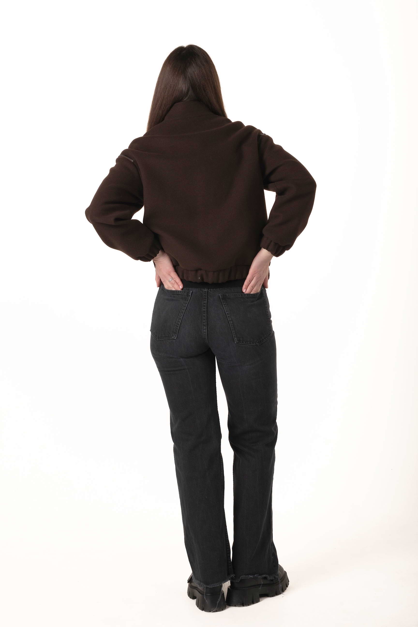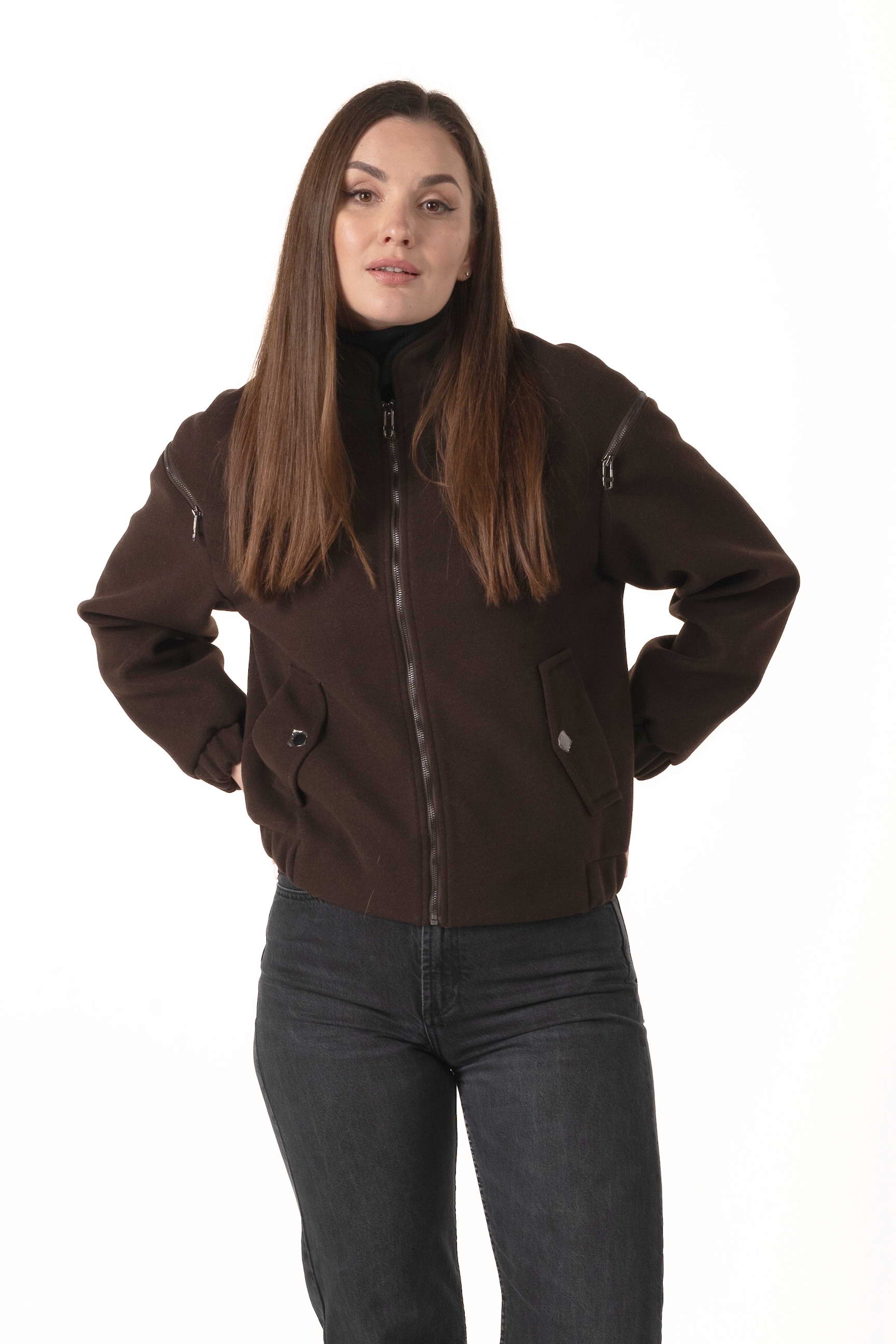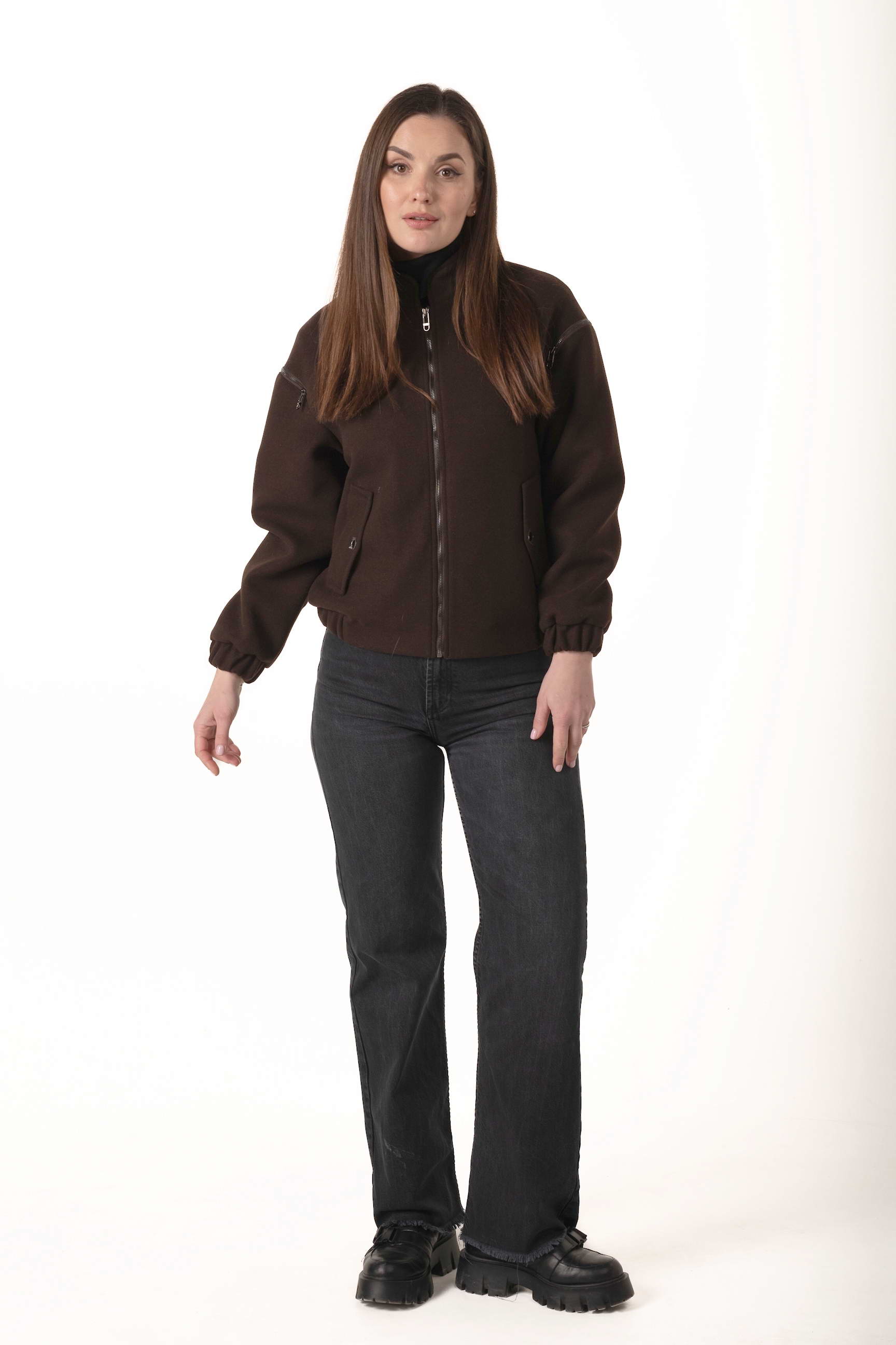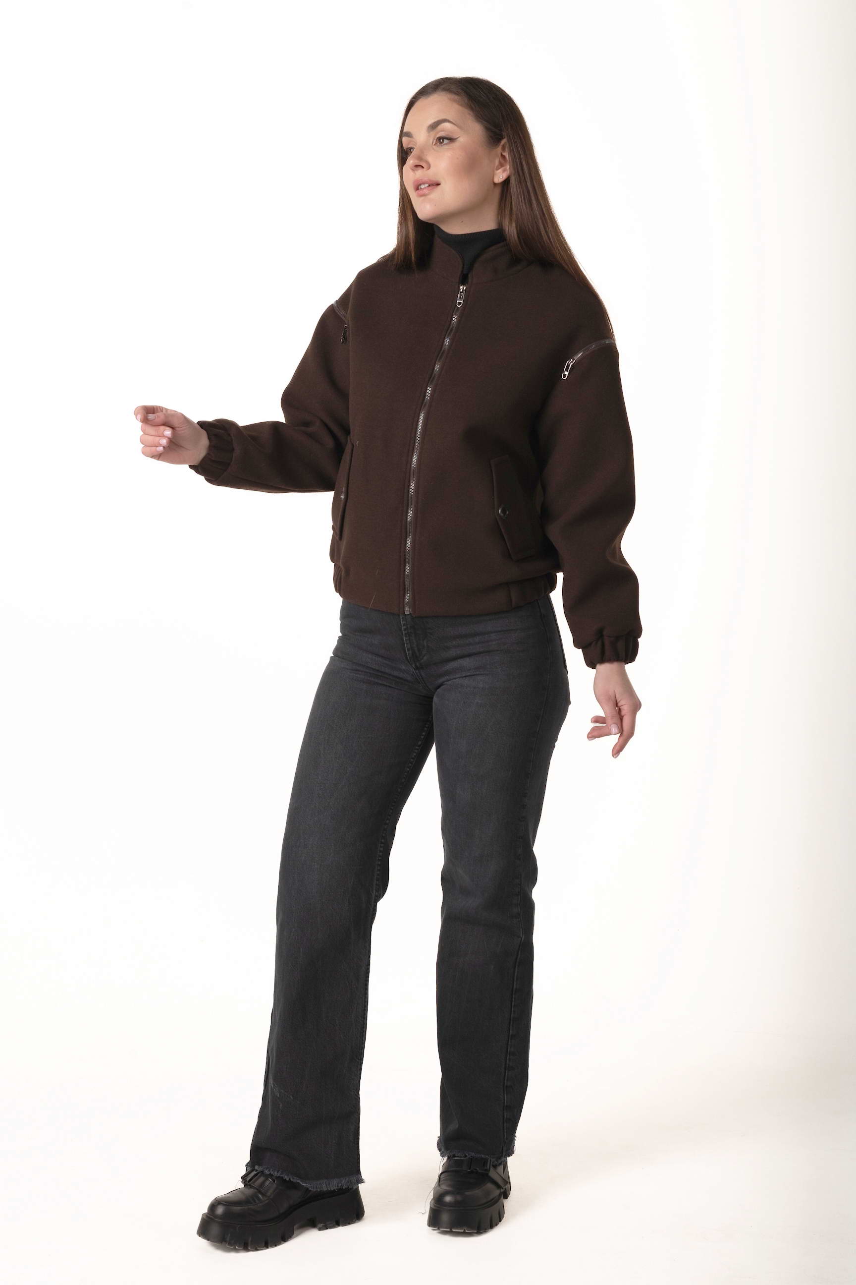Силует-бомбер і довжина 62 см створюють сучасний образ, підкреслюючи стиль та свободу рухів. Коричневий колір додає елегантності та універсальності, поєднується з будь-яким гардеробом і підходить для щоденного носіння.