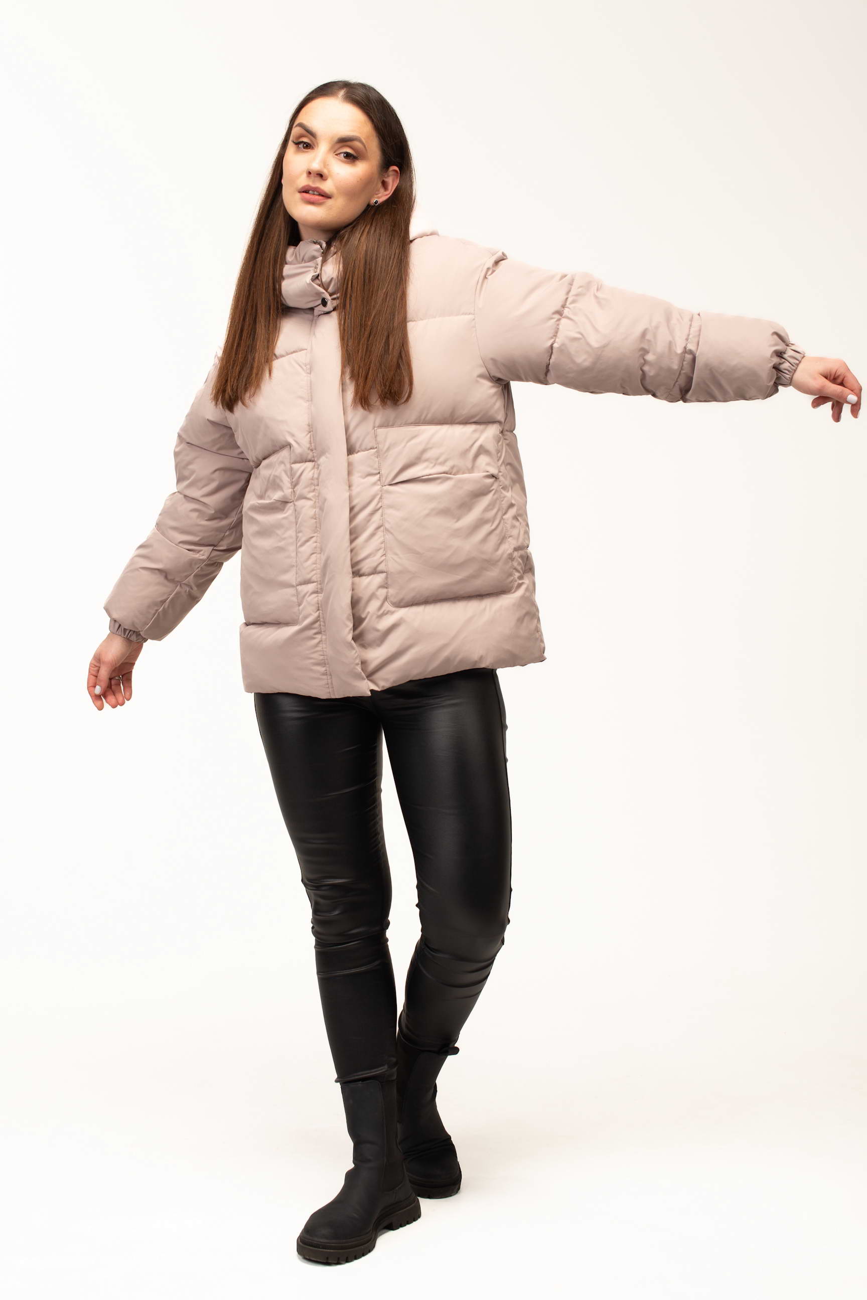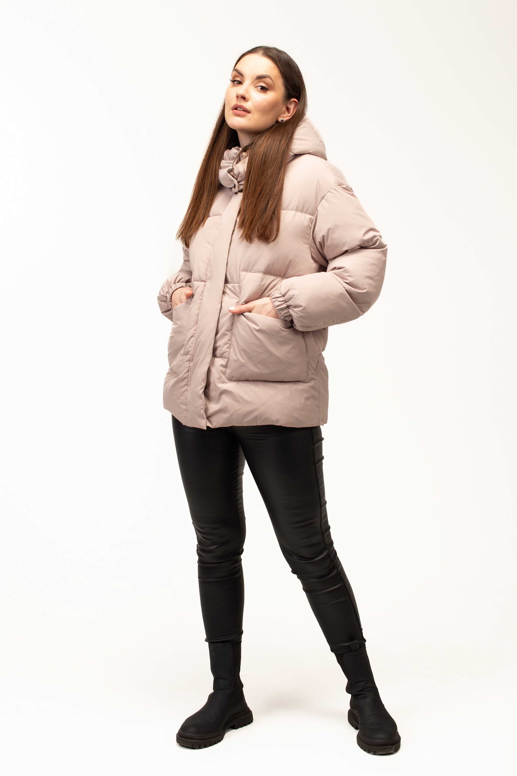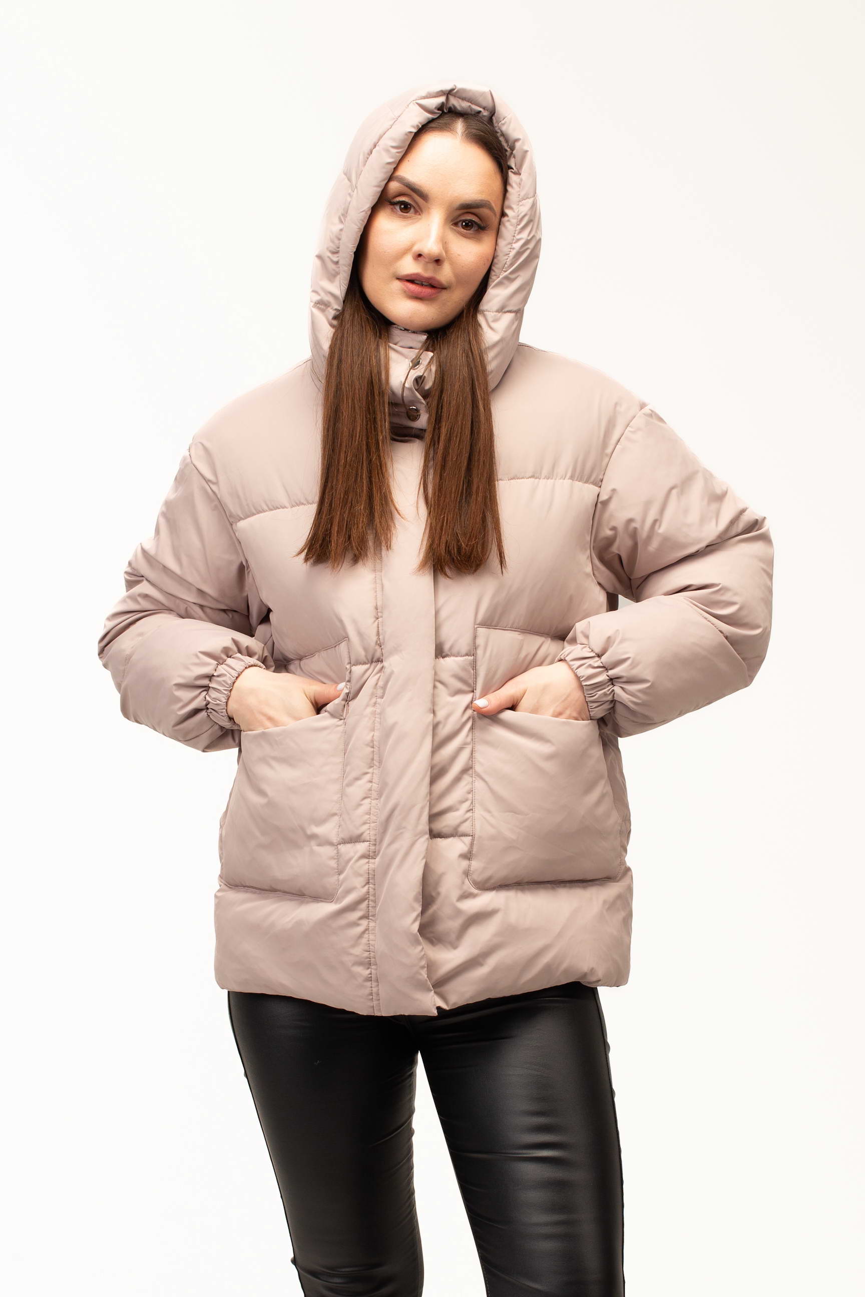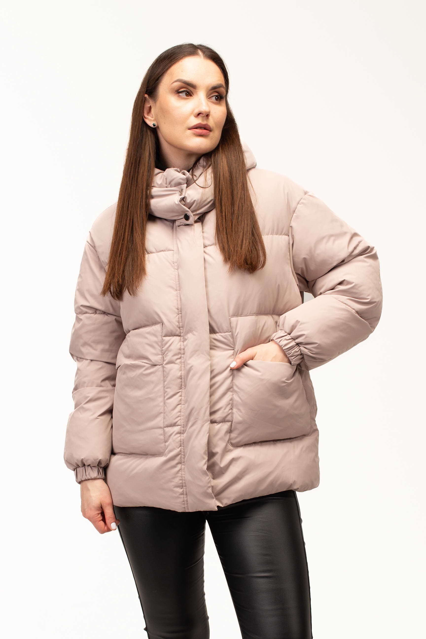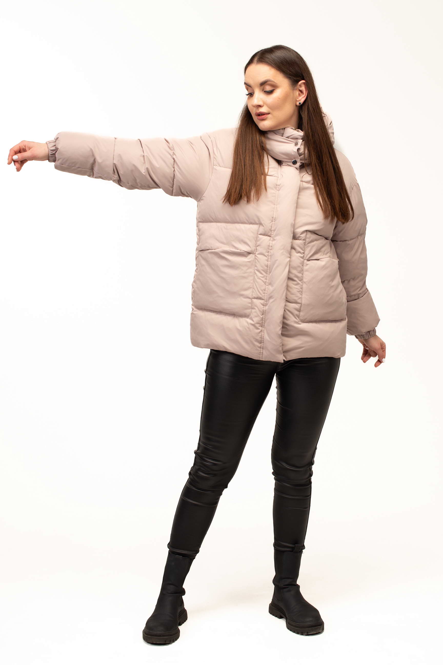 Ніжний бежевий відтінок додає образу елегантності та універсальності, дозволяючи легко комбінувати куртку з різними елементами гардеробу. Довжина 78 см робить модель більш компактною та зручною для активного міського ритму, забезпечуючи при цьому достатній рівень захисту від холоду.