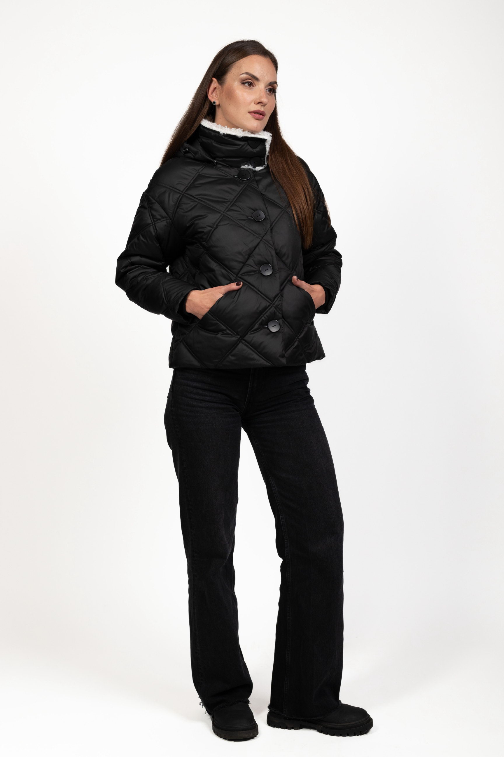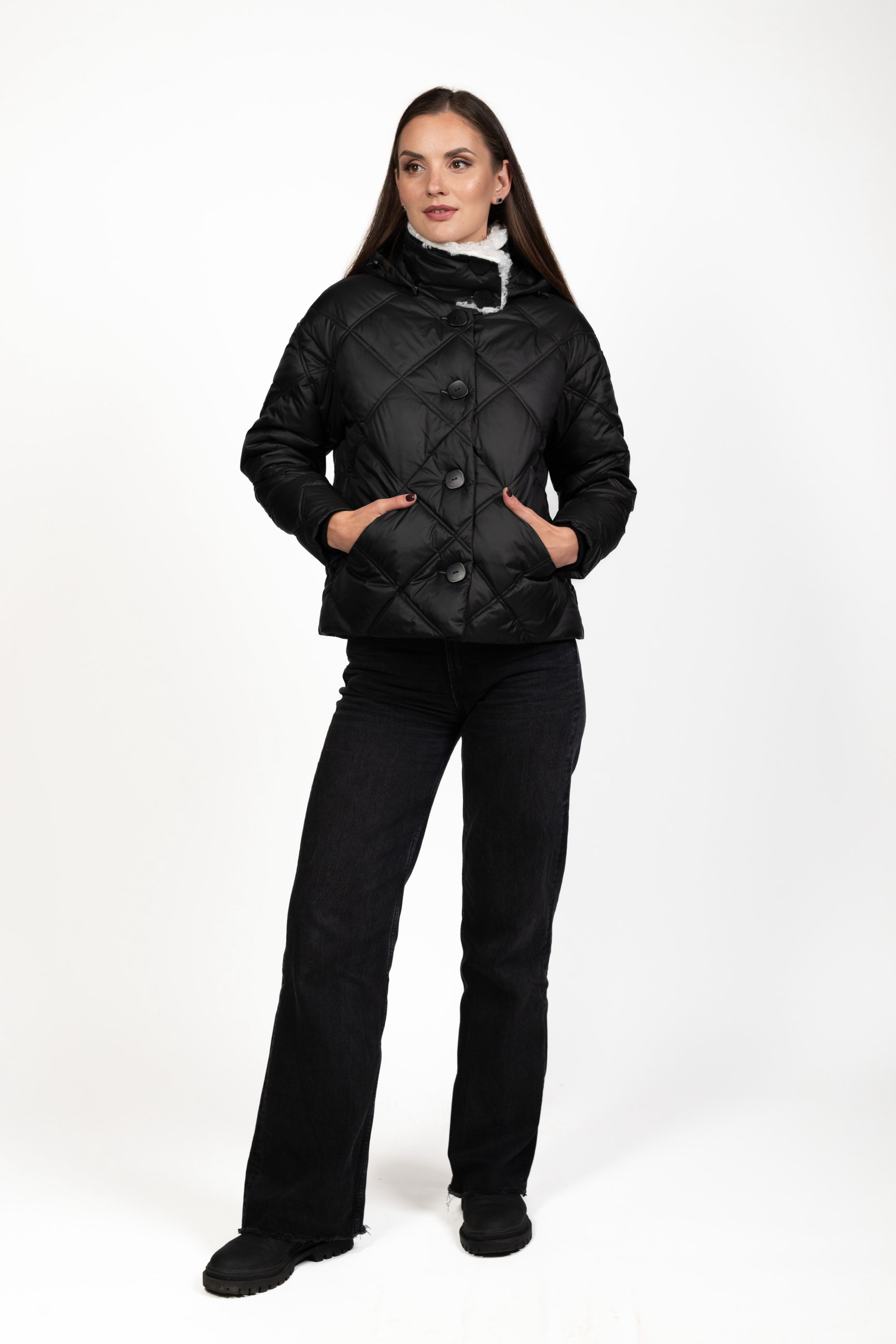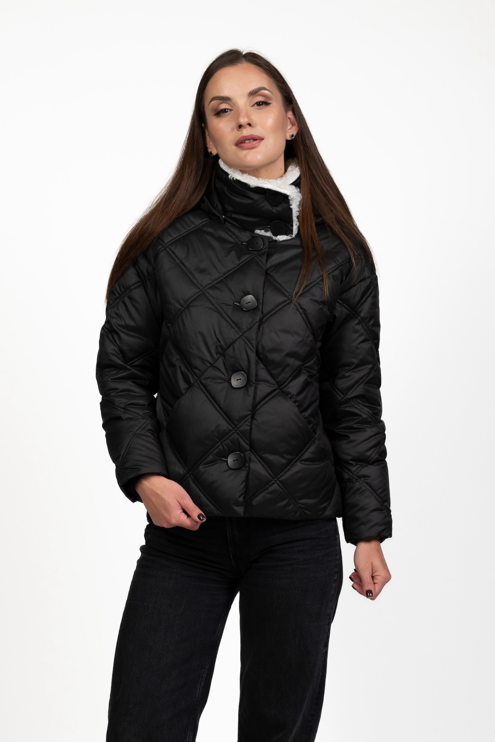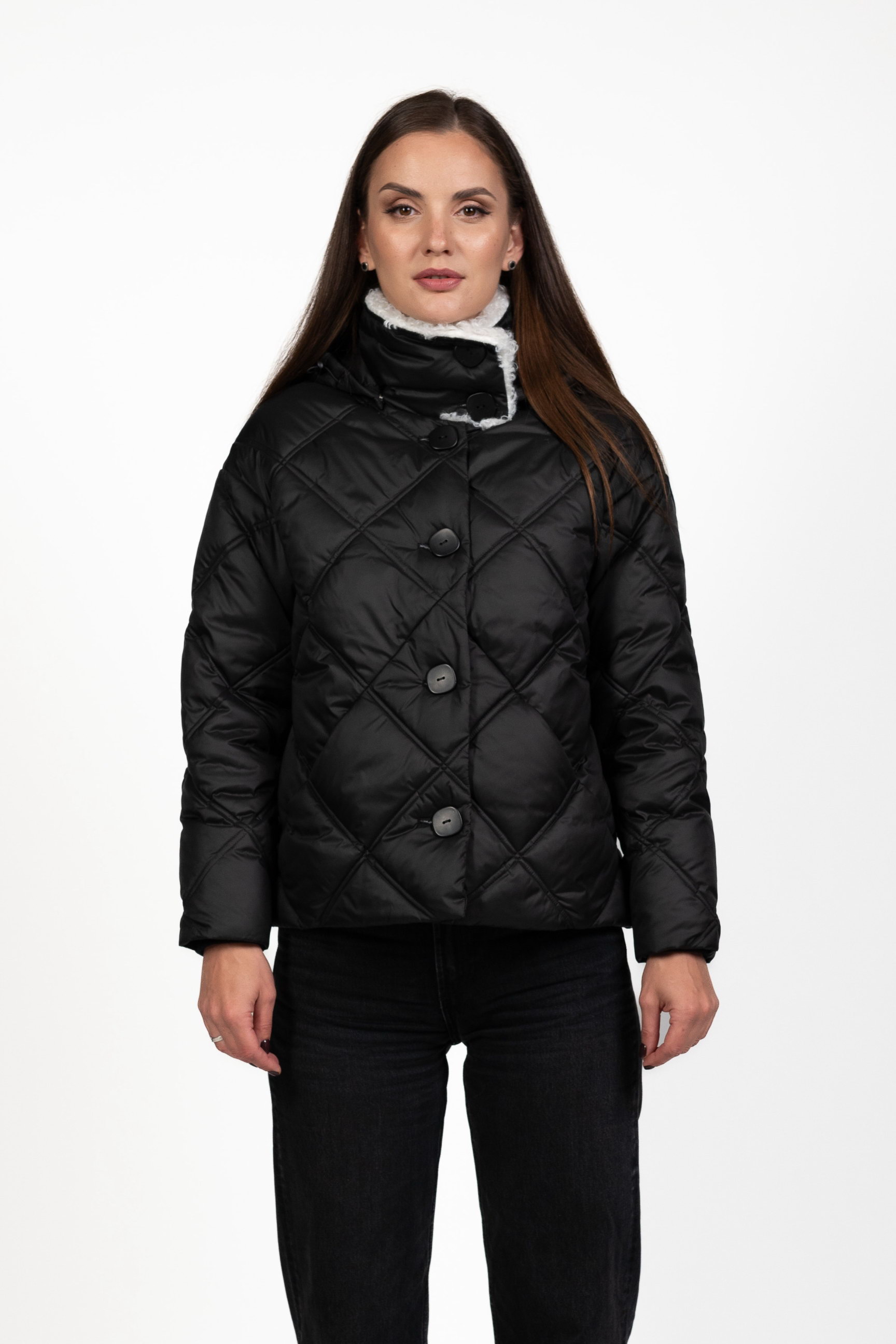 Стьобаний ромбами — модний і сучасний акцент, який підкреслює структуру та стиль пуховика, роблячи його вигляд преміальним.